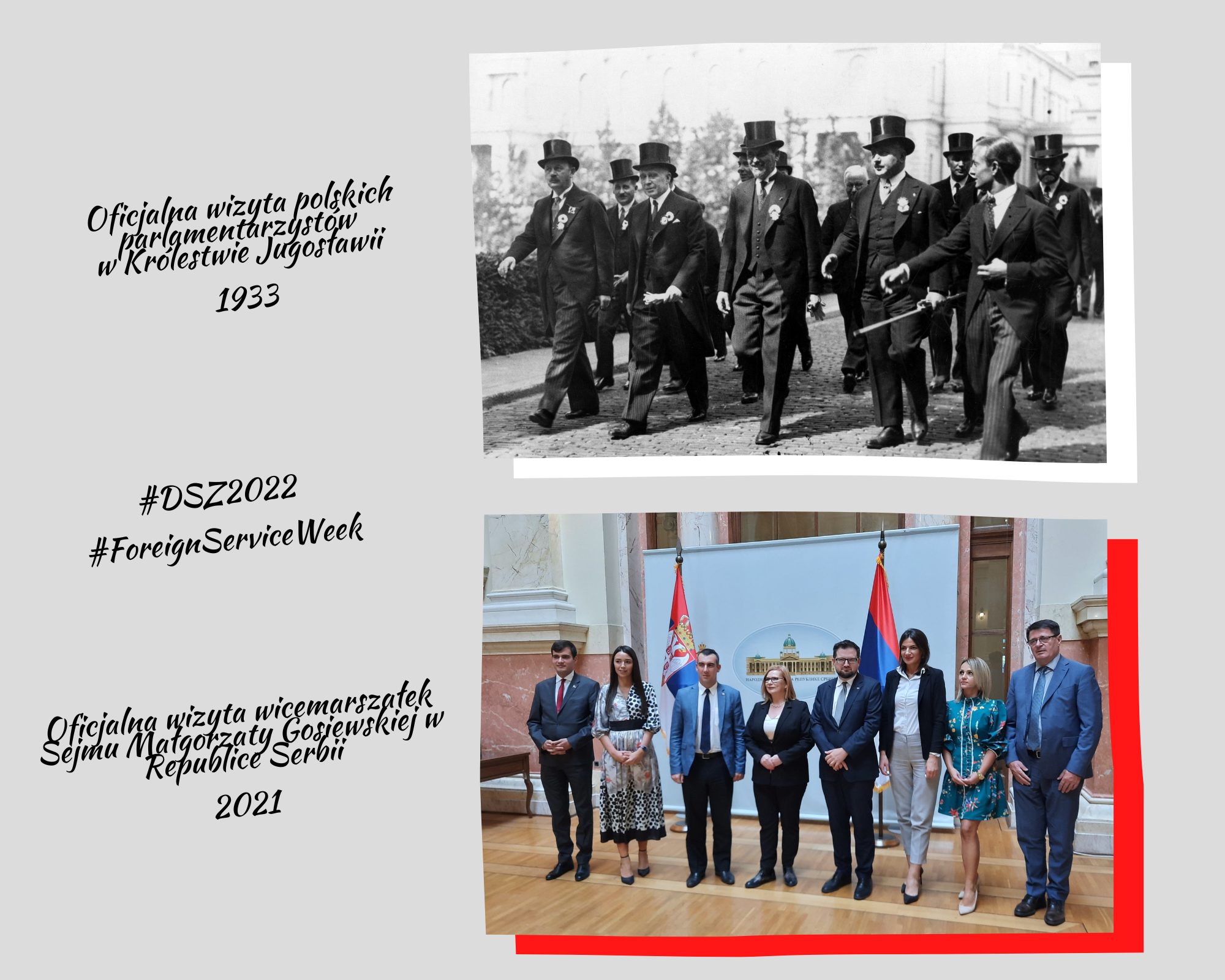 W ramach cyklu w mediach społecznościowych, w dniach 14-18 listopada br. zaprezentowano pogrupowane tematycznie („placówka, personel, szef przedstawicielstwa”; „wizyty”; „kultura i sztuka”, „gospodarka”; „sport”) zestawienia historycznych fotografii dot. poselstwa RP w Belgradzie w okresie międzywojennym, pochodzących ze zbiorów Narodowego Archiwum Cyfrowego w Warszawie, z ich współczesnymi odpowiednikami ilustrującymi pracę naszej placówki w Serbii.