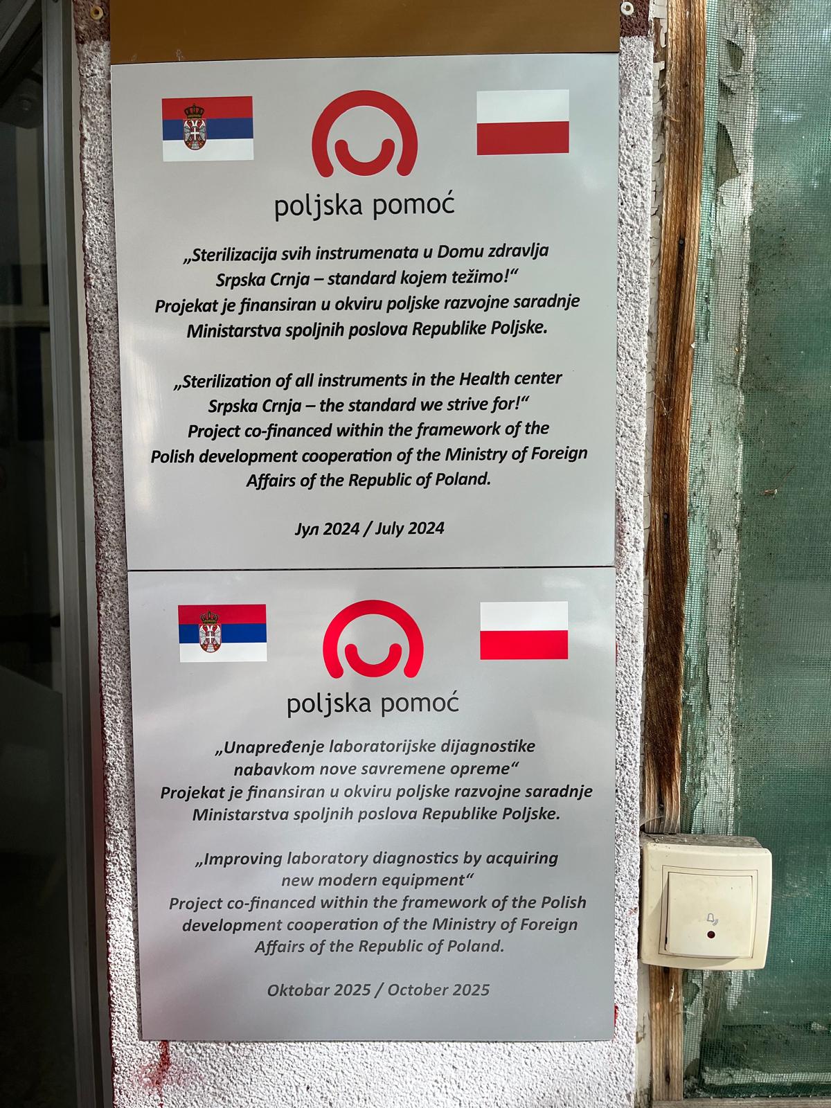 W dniu 15 października Ośrodek Zdrowia w miejscowości Srpska Crna gościł delegację Ambasady RP w Belgradzie, której przewodniczyła chargé d'affaires Kamilla Duda-Kawecka. Ośrodek, dzięki środkom z programu Polska Pomoc, zakupił najnowocześniejsze wyposażenie laboratorium, widoczne na poniższych zdjęciach.