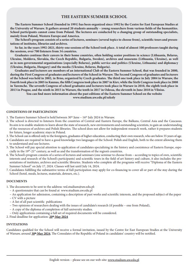 Во тек е аплицирањето за Источната Летна Школа организирана од Центарот за Источна Европа, при Универзитетот во Варшава