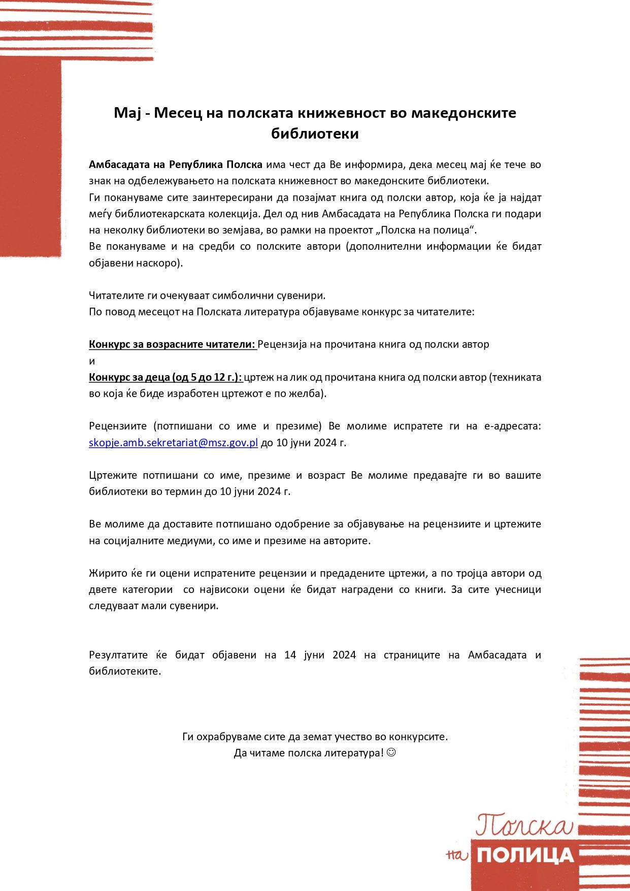 Амбасадата на Република Полска има чест да Ве информира, дека месец мај ќе тече во знак на одбележувањето на полската книжевност во македонските библиотеки.