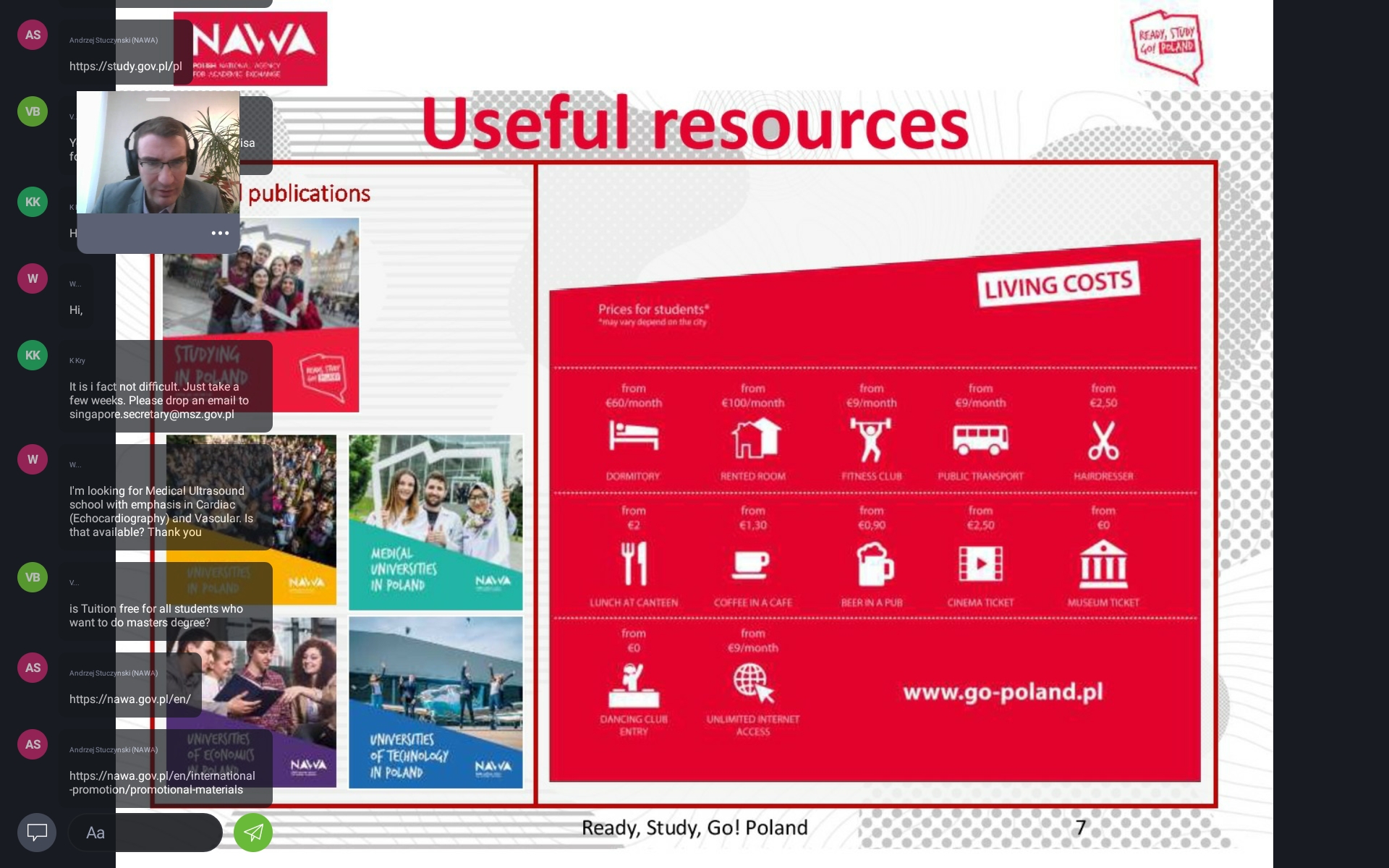 The webinar participants could learn about the higher education in Poland and the advantages of studying in the European Union country with internationally recognised standards as well as receive practical advice on admission rules, scholarship offer and everyday life. The first-hand experience from studying in Poland was shared by a Singaporean graduate of the Warsaw School of Economics and NAWA scholarship recipient.