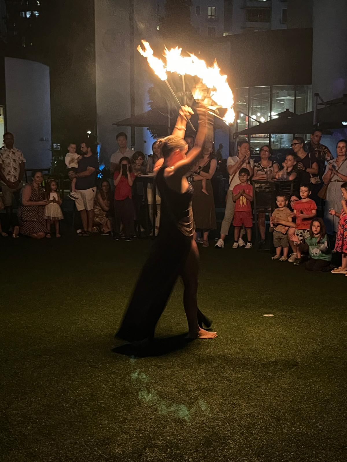 Po zmroku odbył się widowiskowy pokaz ognia w wykonaniu Anny Laksy z Silent Star Singapore.