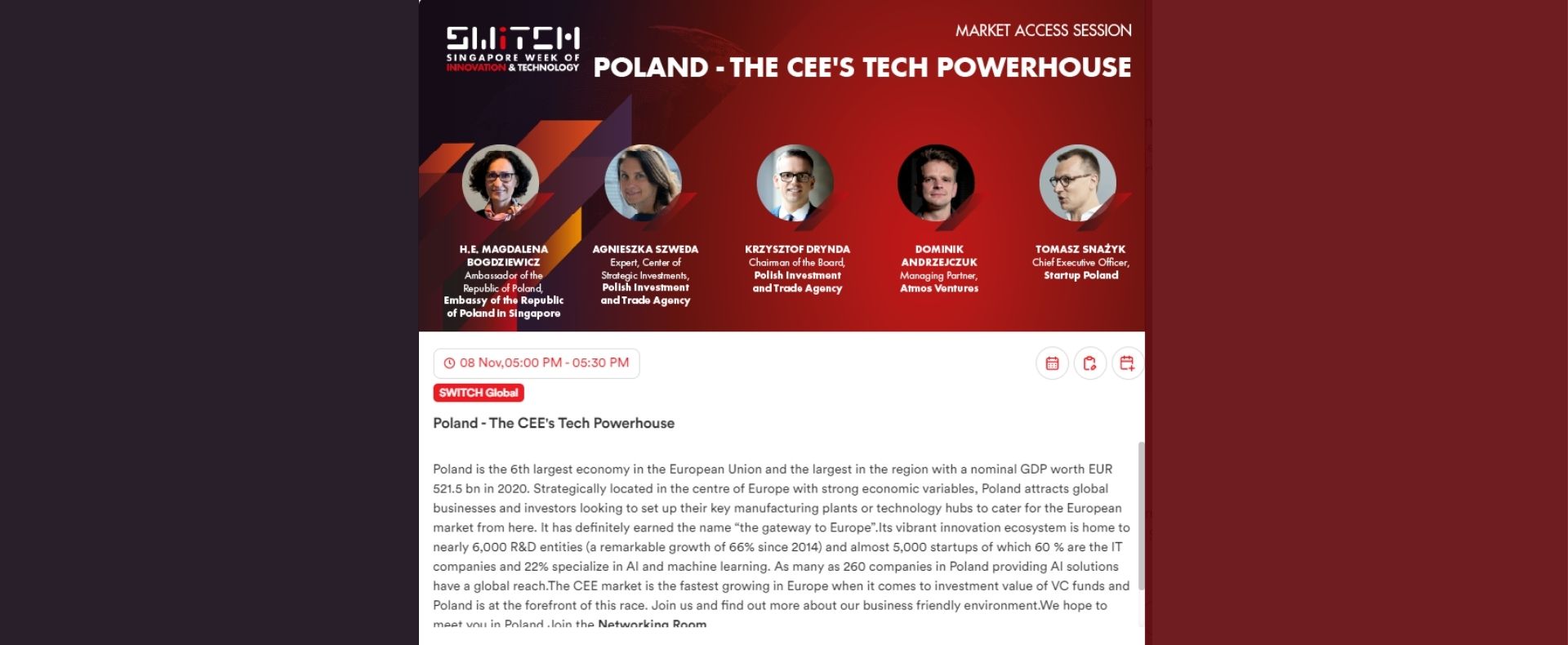 Polska była najliczniej reprezentowanym krajem Unii Europejskiej w wydarzeniu towarzyszącym konferencji SWITCH, łączącym klastry europejskie i singapurskie, zorganizowanym w ramach umowy o współpracy zawartej między Unią Europejską i Singapurem w 2020 r.