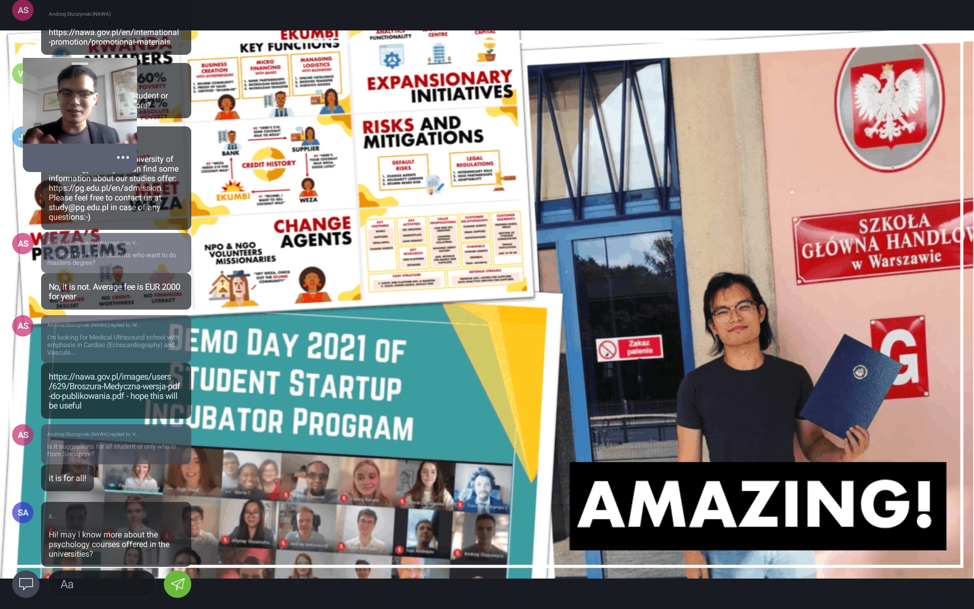 Uczestnicy wydarzenia zapoznali się z zasadami rekrutacji i ofertą stypendialną, otrzymując szereg praktycznych informacji dotyczących warunków życia w Polsce i korzyści wynikających z podjęcia kształcenia w Unii Europejskiej, zgodnego z uznanymi międzynarodowo zasadami. O pozytywnych doświadczeniach z okresu studiów w Polsce opowiedział także singapurski absolwent SGH w Warszawie.