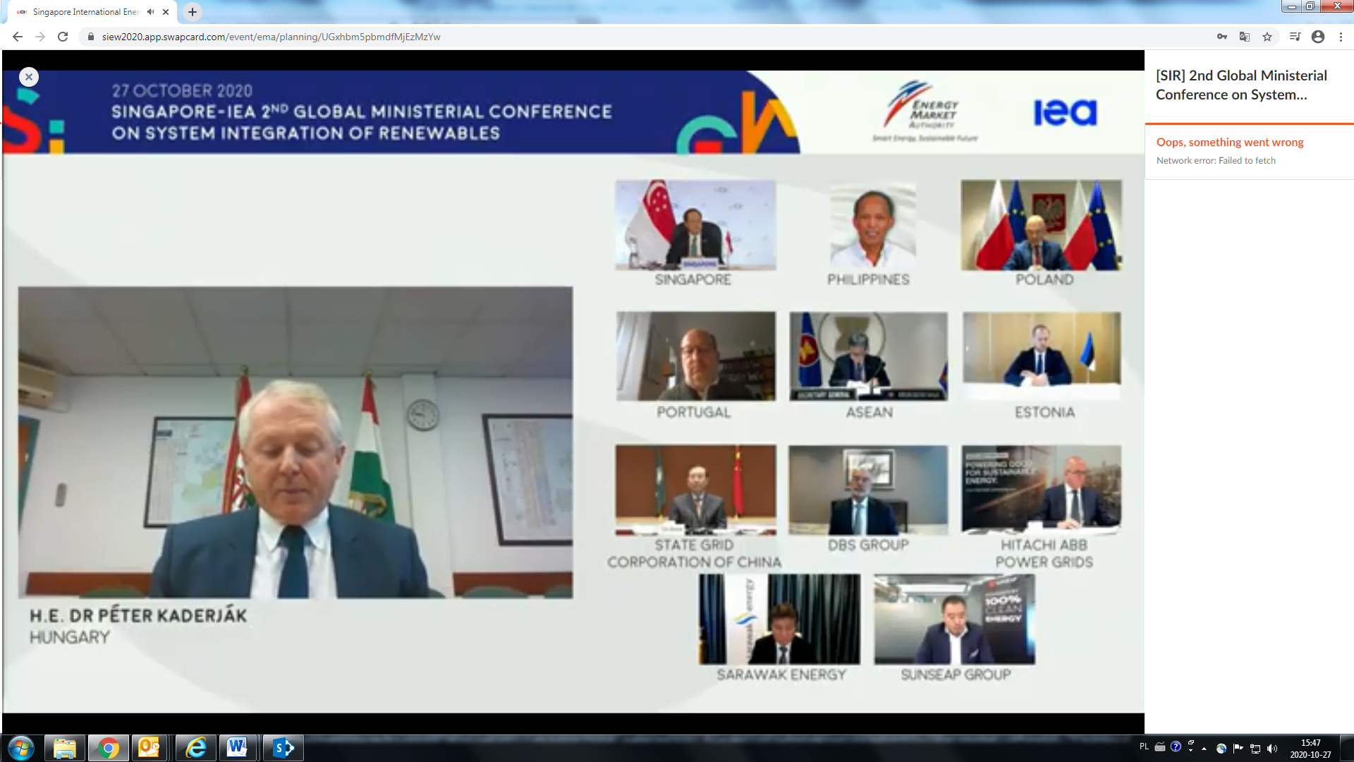 O transformacji polskiego sektora energetycznego, sukcesywnym wprowadzaniu w Polsce przyjaznych klimatowi źródeł energii, skutkującym zmniejszeniem emisyjności gospodarki oraz o potrzebie zapewnienia sprawiedliwej transformacji na drodze UE do osiągnięcia neutralności klimatycznej mówił Minister Klimatu i Środowiska Michał Kurtyka podczas 2. Globalnej Konferencji Ministerialnej ws. Systemu Integracji Odnawialnych Źródeł Energii, organizowanej w formule wirtualnej 27 października 2020 r. w ramach Singapore International Energy Week.