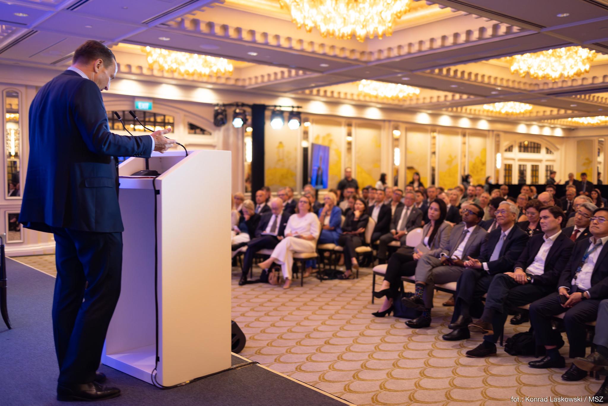 W swoim wystapieniu podkreślił miedzy innymi, że wszyscy żyjemy w otoczeniu wielkich, potężnych i czasami nieprzewidywalnych państw o globalnych ambicjach. Aby jednak zachować prawo do samodzielnego wyboru własnej drogi, musimy uniemożliwić rewizjonistycznym mocarstwom podważenie systemu opartego na prawie międzynarodowym. Choć system ten może mieć swoje wady i być przestarzały, odpowiedzią na te słabości powinna być reforma, a nie wojna.