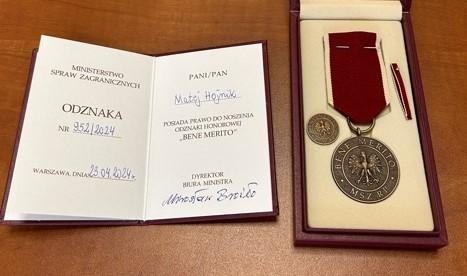 Veleposlanik Republike Poljske Krzysztof Olendzki je z vročitvijo znaka Bene Merito, ki ga je podelil minister za zunanje zadeve Republike Poljske, odlikoval gospoda Mateja Hojnika na proslavi ob 233. obletnici sprejetja ustave 3. maja, je ki potekala 15. maja 2024 v Ljubljani.