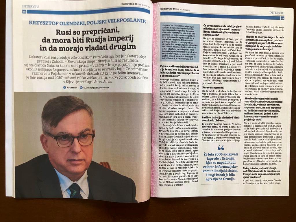 V četrtek, 16. marca, je bil v tedniku Domovina objavljen intervju Roka Freliha z veleposlanikom Republike Poljske v Sloveniji Krzysztofom Olendzkim o ruskem imperializmu in njegovih dramatičnih posledicah za Ukrajino, Evropo in svet v zadnjem letu, odkar je Rusija izvedla neizzvani napad na Ukrajino.