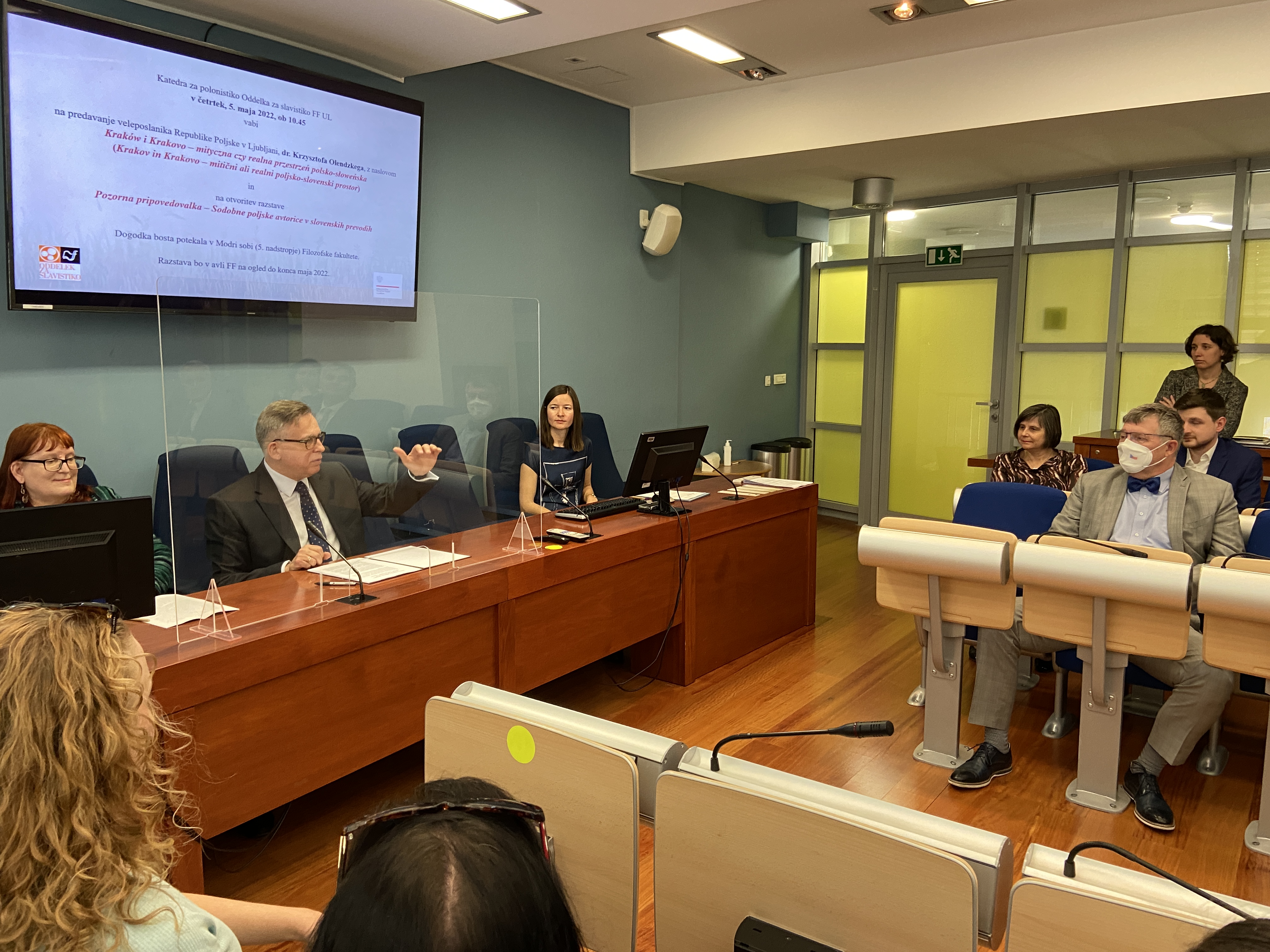 Veleposlanik dr Krzysztof Olendzki je imel 5.maja na Filozofski fakulteti UL predavanje z naslovom "Krakov in Krakovo – poljsko-slovenski prostor mita ali resnice oziroma Kako z rahločutnostjo govoriti o zgodovini".