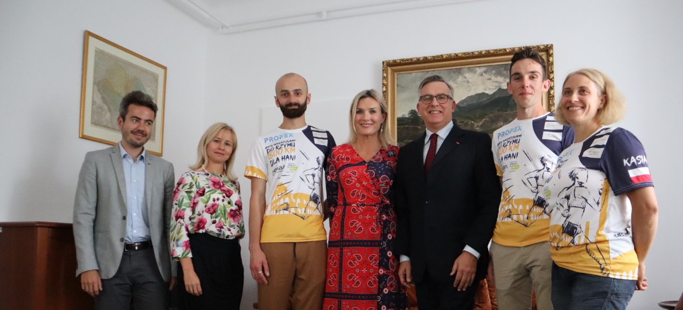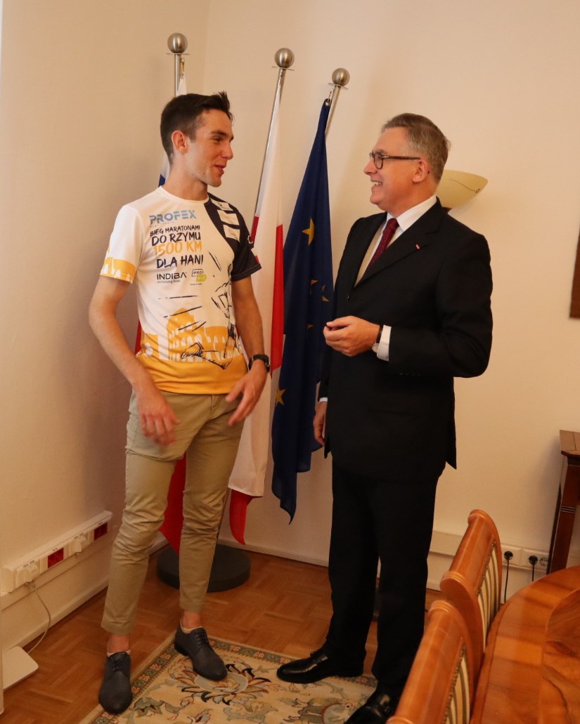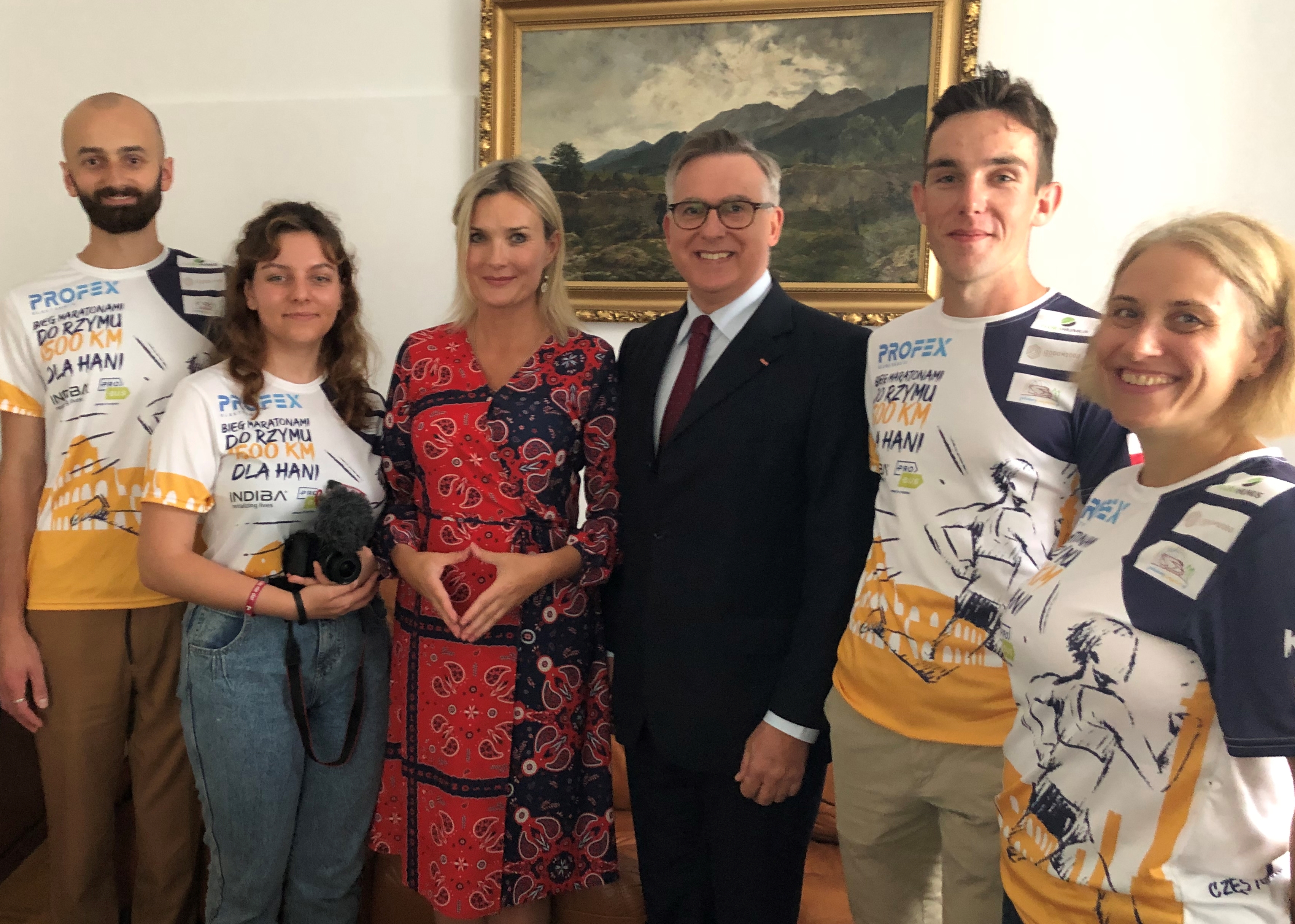 Veleposlanik Krzysztof Olendzki, soproga veleposlanika Joanna Olendzka ter osebje Veleposlaništva Republike Poljske v Ljubljani so se srečali z g. Tomaszem Sobanio in njegovimi prijatelji – člani dobrodelnega teka od Jasne Góre do Rima, da bi na tak način pomagali bolni deklici Hani, ki ima tumor na možganih. Srečanje v Ljubljani je bila priložnost za pogovor o smislu življenja, preseganju meja in pomoči drugim.