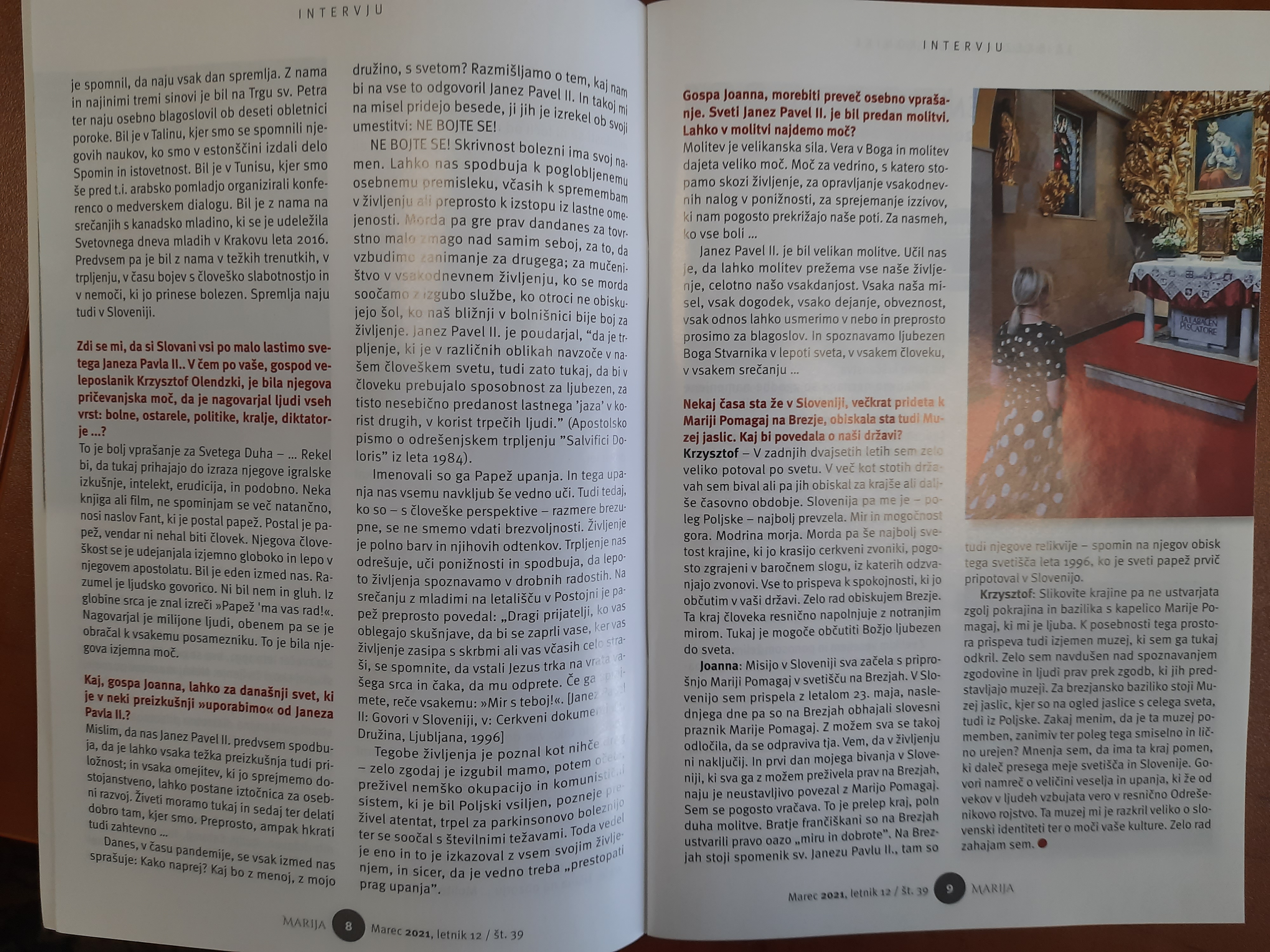 Joanna Olendzka: Misijo v Sloveniji sva začela s priprošnjo Mariji Pomagaj v svetišču na Brezjah. V Slovenijo sem prispela z letalom 23. maja, naslednjega dne pa so na Brezjah obhajali slovesni praznik Marije Pomagaj. Z možem sva se takoj odločila, da se odpraviva tja. Vem, da v življenju ni naključij. In prvi dan mojega bivanja v Sloveniji, ki sva ga z možem preživela prav na Brezjah, naju je neustavljivo povezal z Marijo Pomagaj. Sem se pogosto vračava. To je prelep kraj, poln duha molitve. Bratje frančiškani so na Brezjah ustvarili pravo oazo „miru in dobrote”. Na Brezjah stoji spomenik sv. Janezu Pavlu II., tam so tudi njegove relikvije – spomin na njegov obisk tega svetišča leta 1996, ko je sveti papež prvič pripotoval v Slovenijo.