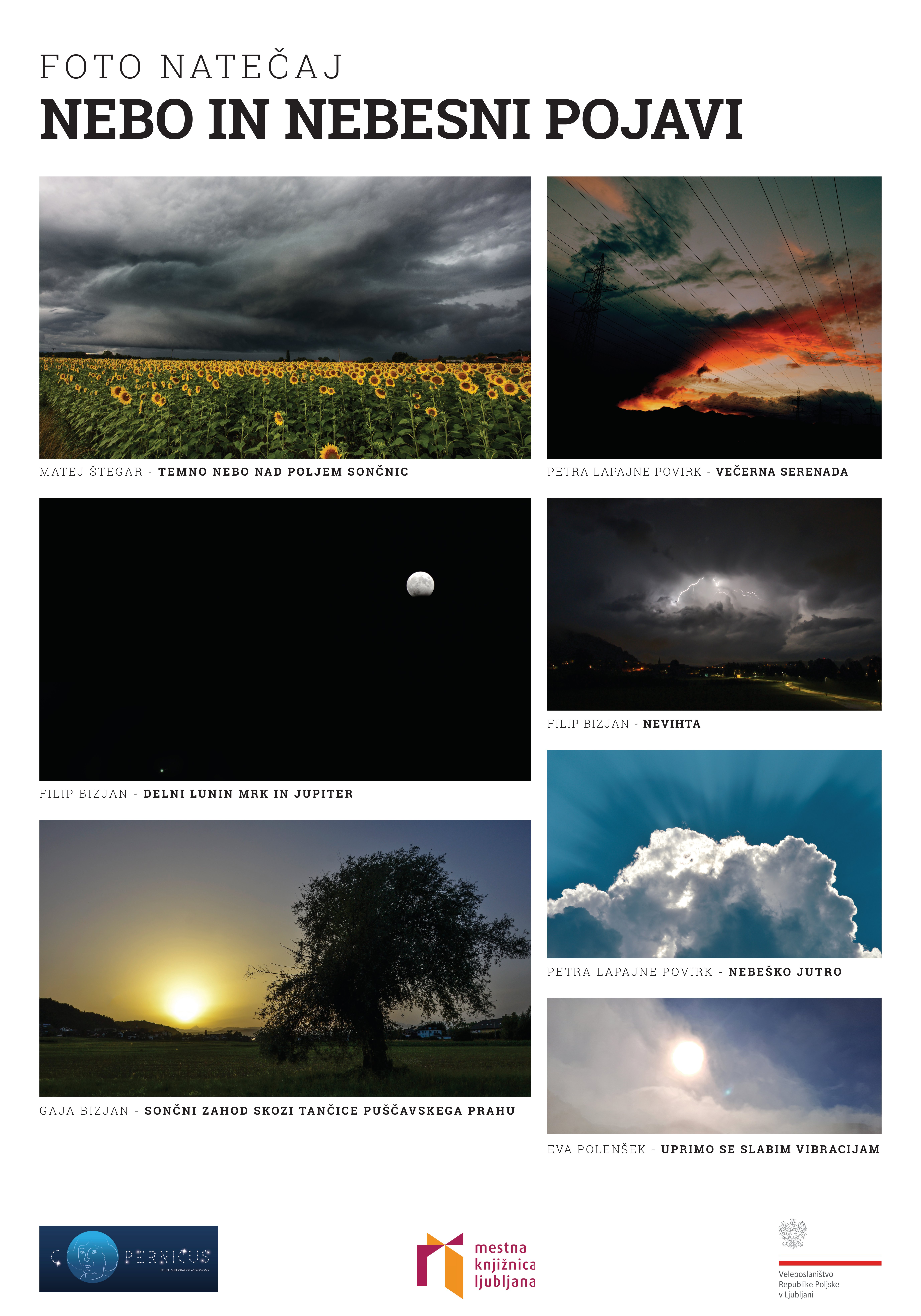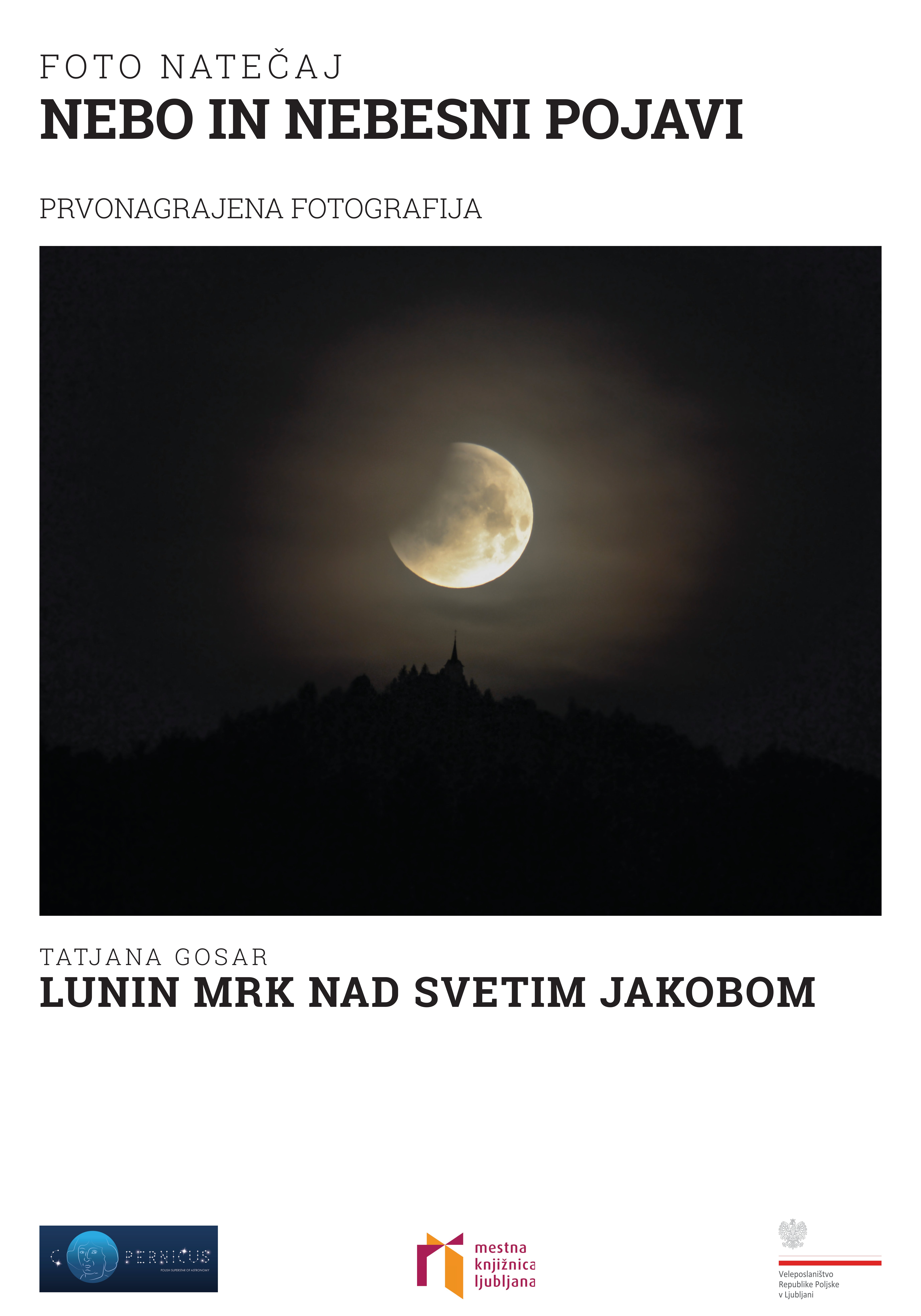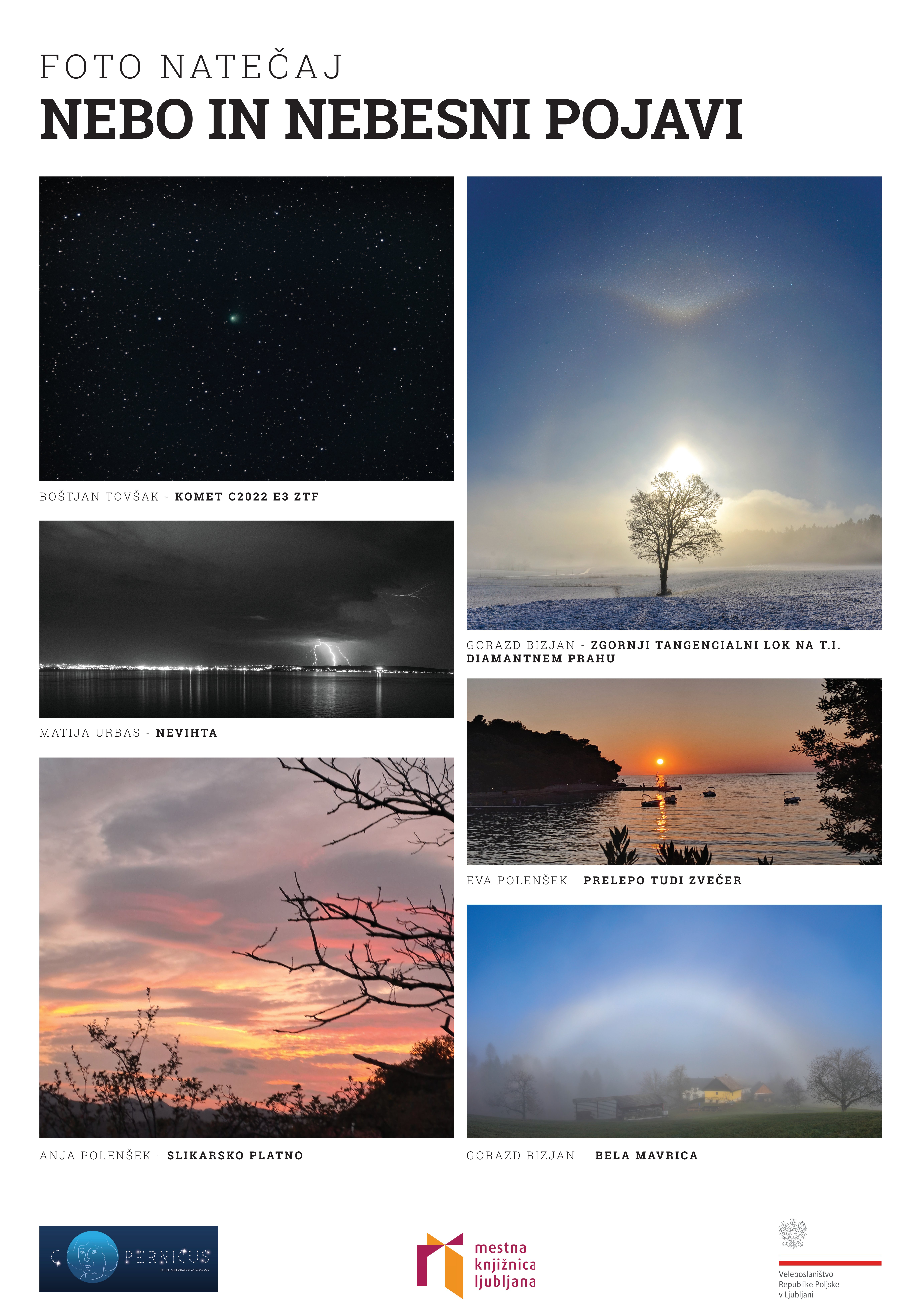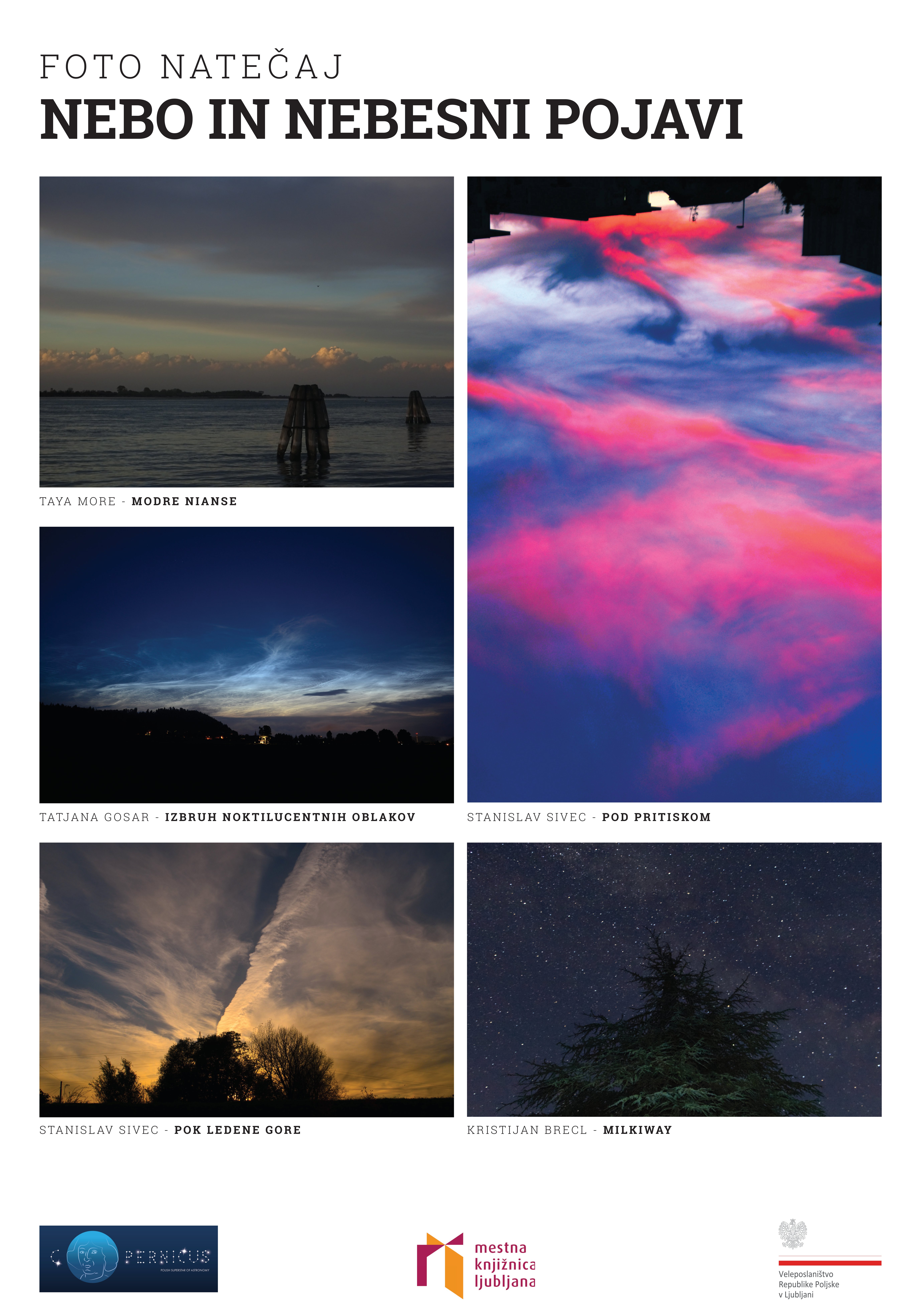 Natečaj, na katerem smo iskali najzanimivejše spontane trenutke na nebu, ujete v objektiv fotoaparata, je bil organiziran ob 550. obletnici rojstva poljskega astronoma Nikolaja Kopernika. Avtorjem nagrajenih fotografij in vsem udeležencem natečaja iskreno čestitamo. Razstavljene fotografije so na ogled še do januarja 2024 v Mestni knjižnici Ljubljana - Knjižnici Jožeta Mazovca, Zaloška cesta 61 v Ljubljani. Vljudno vabljeni!