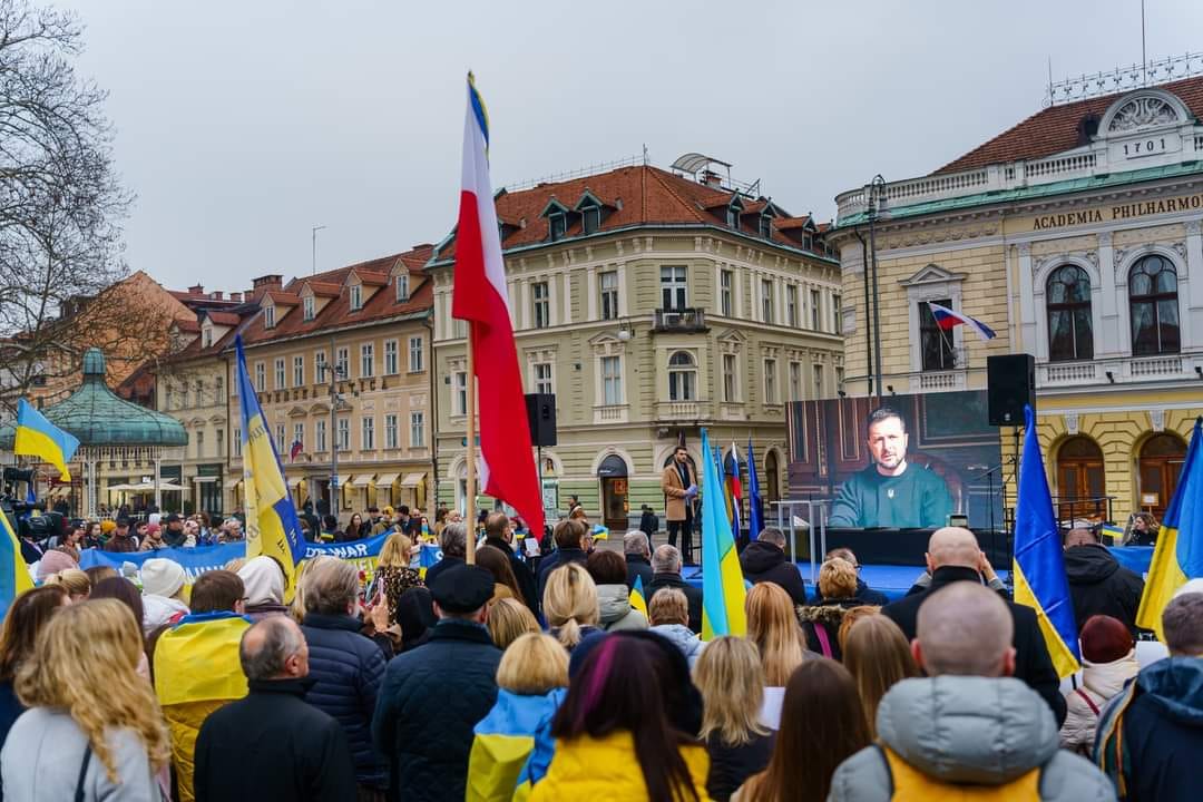 Več sto udeležencem shoda se je za podporo in pomoč zahvalil veleposlanik Ukrajine v Sloveniji Andrii Taran, ki je v nagovoru poudaril, da v teh krvavih dneh v Ukrajini potekajo boji za prihodnost in varnost Evrope in sveta.