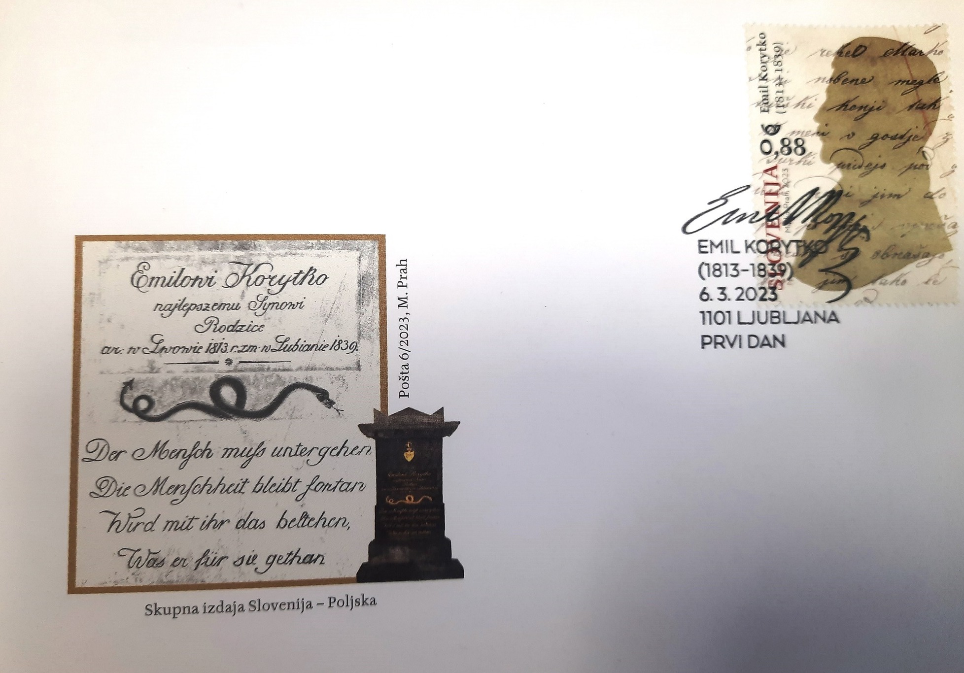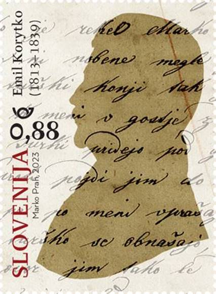 Na žigu prvega dne ob izdaji skupne poljsko-slovenske poštne znamke o Emilu Korytku (1813–1839), poljskem etnografu, zbiratelju ljudskih pesmi in folkloristu, avtorju Slovenskih pesmi krajnskiega naroda, ki so posthumno izšle v petih snopičih, je natisnjen datum 6. marec 2023.