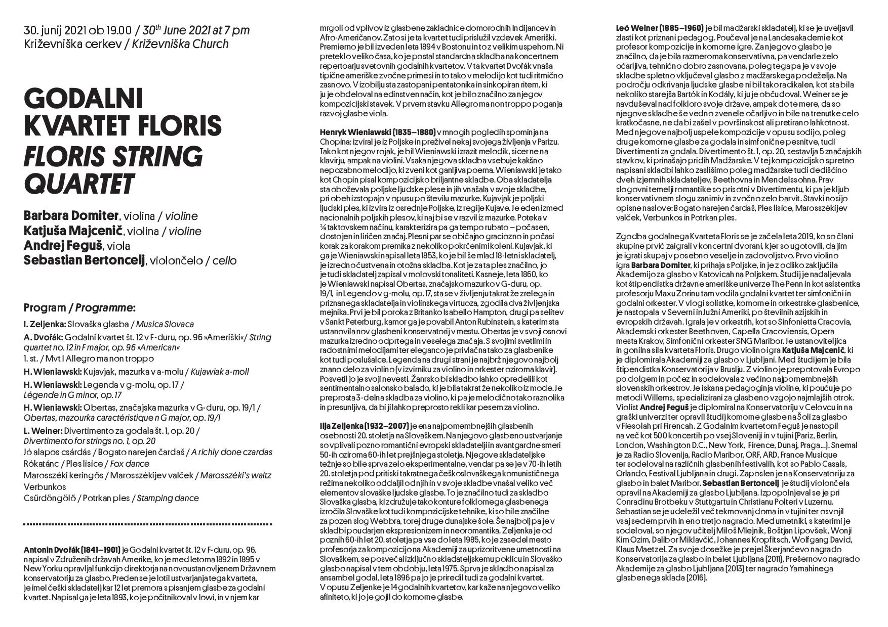 Izvajalci koncerta Godalni kvartet Floris, ki ga sestavljajo Barbara Domiter – prva violina, Katjuša Majcenič – druga violina, Andrej Feguš – viola in Sebastian Bertoncelj – violončelo so poslušalcem predstavili glasbo iz držav V4. Gostje so prisluhnili naslednjim skladbam: Ilja Zeljenka - Musica Slovaca; Antonín Dvořák - Godalni kvartet op. 96 št. 12 v F-duru, I. del Allegro ma non troppo; Henryk Wieniawski - Kujawiak v a-molu, Legenda op. 17 (avtorja aranžmaja – skladba je bila izvorno napisana za violino in klavir – sta zakonca poljsko-slovenskega rodu Nikola in Dominik Frankiewicz), Obertas v G-duru ter Leo Weiner - Divertimento št. 1: Jó alapos csárdás, Rókatánc, Marosszéki keringős, Verbunkos, Csűrdöngölő.