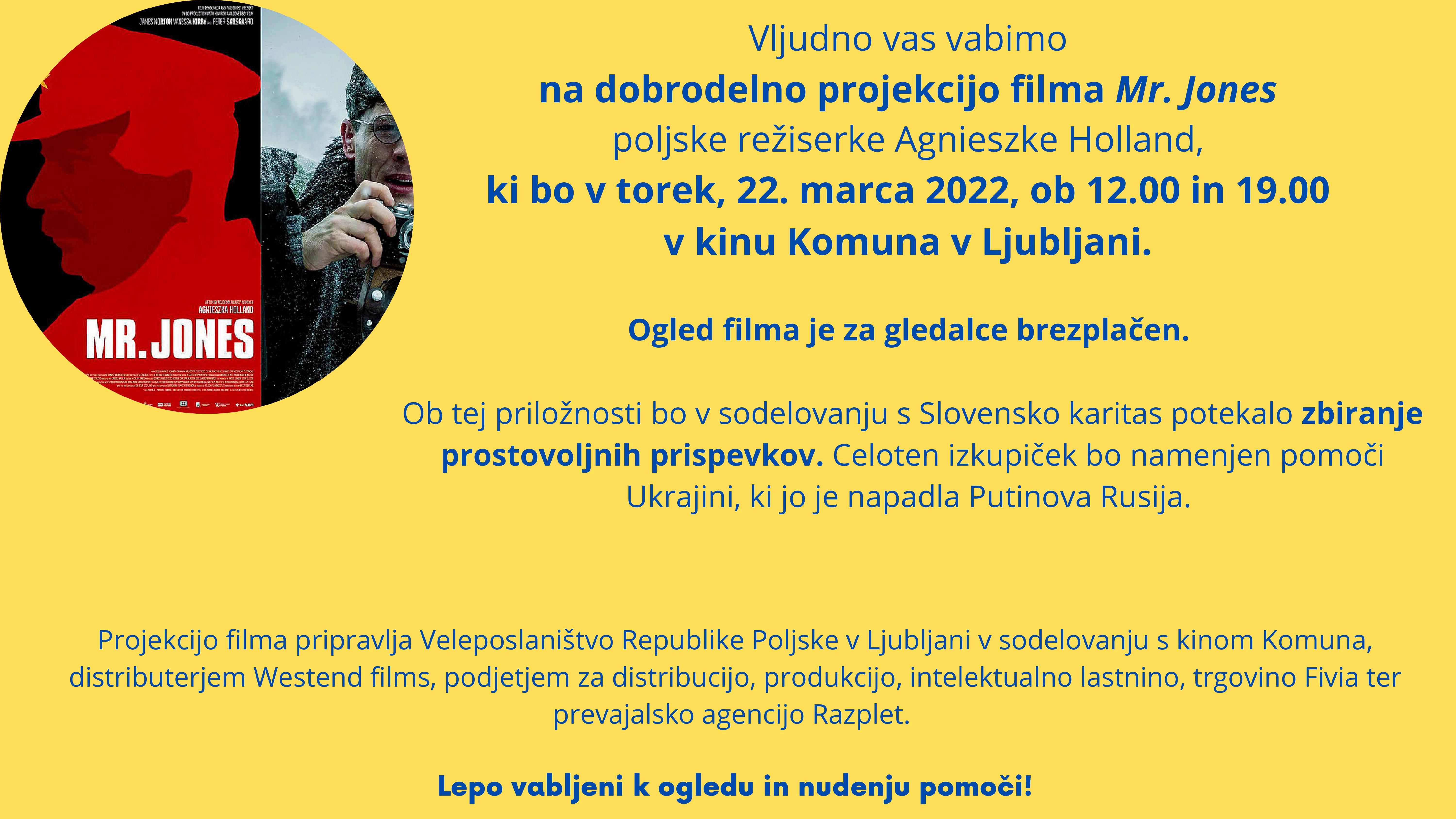 Na pobudo Veleposlaništva Republike Poljske v Ljubljani sta v torek, 22. marca, v Ljubljani potekali dobrodelni prijekciji filma Gospod Jones v režiji Agnieszke Holland. Ob tej priložnosti so prostovoljski Slovenske karitas zbirali sredstva za Ukrajino. Ogleda filma so se udeležili tako predstavniki slovenske vlade, diplomati, ki službujejo v Sloveniji, kot tudi poljska diaspora.