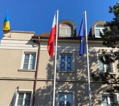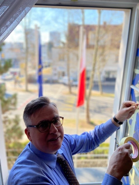 V znak solidarnosti z Ukrajino se v četrtek, 24. marca 2022, ko mineva natanko mesec dni od začetka vojne, naše veleposlaništvo skupaj s posamezniki in organizacijami po celem svetu vključuje v projekt ukrajinske umetnice Darie Koltsove Teorije varovanja. Naše okenske šipe smo polepili z zaščitnimi trakovi, prav tako kot prebivalci Ukrajine, ki varujejo svoje domove pred bombardiranjem.
