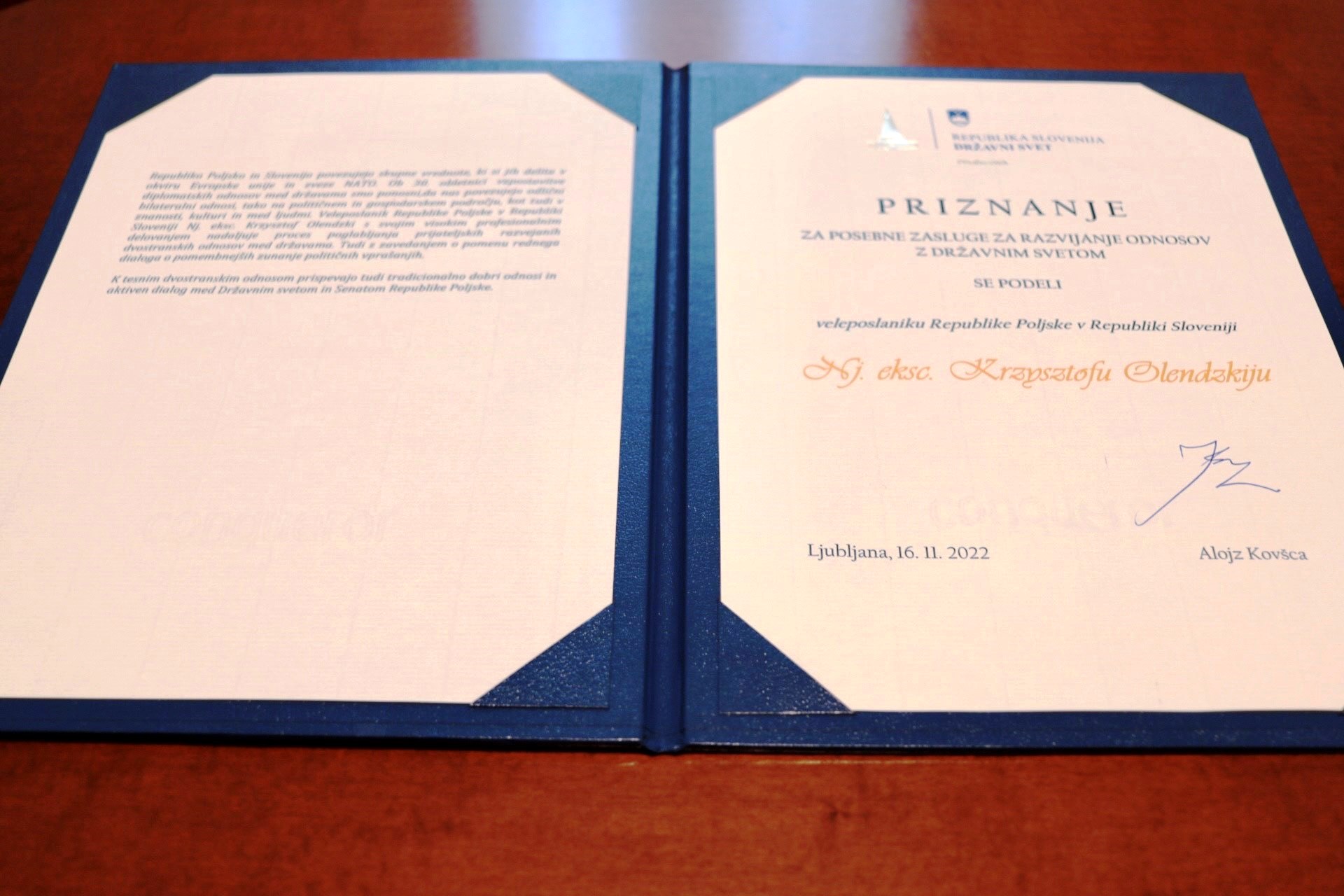 Predsednik Državnega sveta Republike Slovenije Alojz Kovšca je 2. decembra 2022 veleposlaniku Republike Poljske v Sloveniji Krzysztofu Olendzkemu vročil priznanje in medaljo Državnega sveta Republike Slovenije za posebne zasluge za razvijanje dvostranskega prijateljskega sodelovanja med Republiko Poljsko in Republiko Slovenijo ter kot izraz njegovega visokega profesionalnega delovanja.