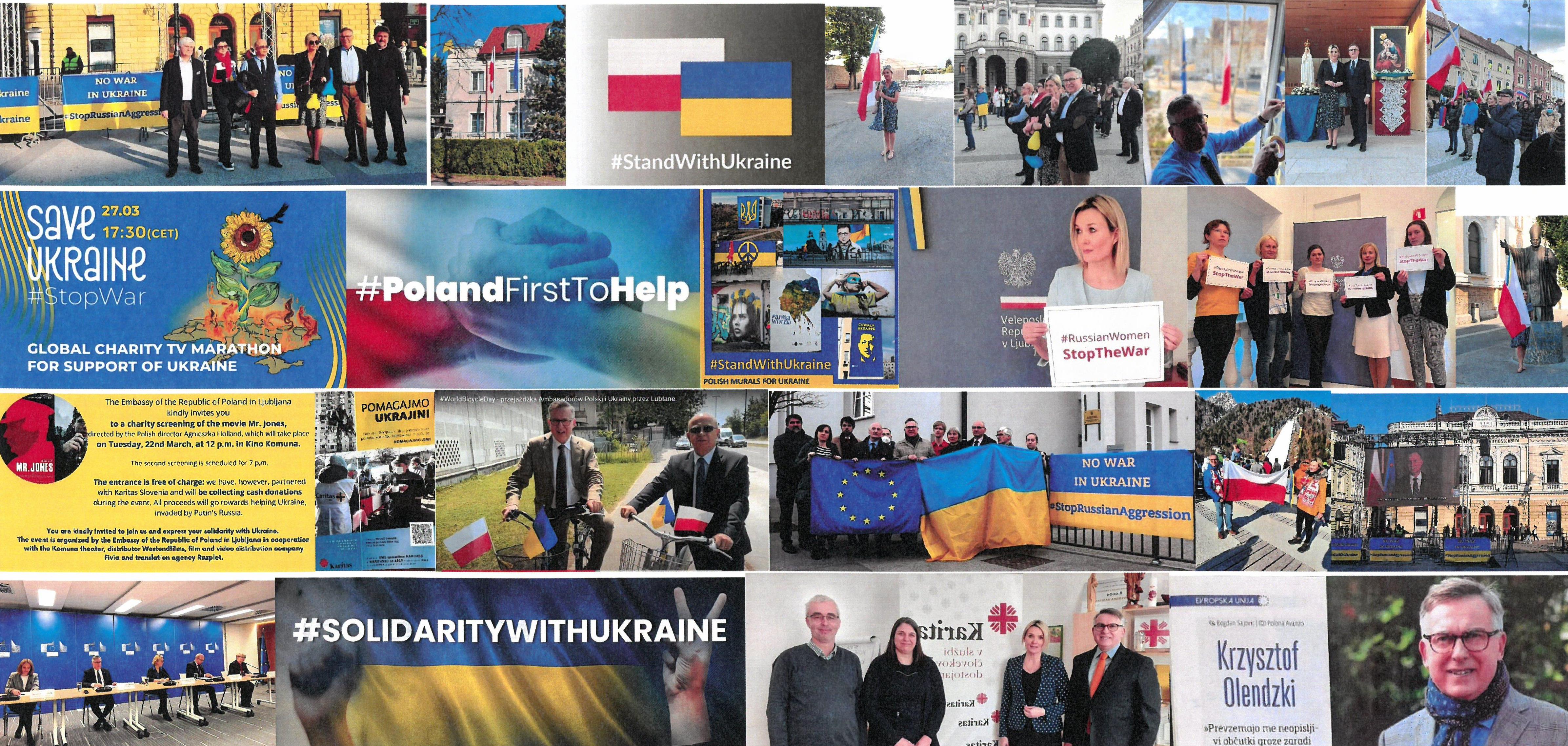 Od prvih dni vojne v Ukrajini je Veleposlaništvo Republike Poljske v Ljubljani organiziralo ali kot soorganizator sodelovalo v shodih, koncertih, filmskih projekcijach, novinarskih konferenach pa tudi v bogoslužjih za mir v Ukrajini. Veleposlaništvo je usklajevalo dobrodelne zbiralne akcije ter ponujeno pomoč slovenskih zdravnikov. Vključilo se je v pobude, s katerimi smo želeli izkazati solidarnost z Ukrajino, npr. lepljenje oken, pobudo „Ruske ženske, ustavite vojno” ter multimedijski prenos dobrodelnih koncertov iz Varšave na Kongresnem trgu v Ljubljani. Veleposlaništvo se je na različne načine dejavno vključevalo v ozaveščanje o dezinformacijah. Večkrat je tesno sodelovalo z Veleposlaništvom Ukrajine.