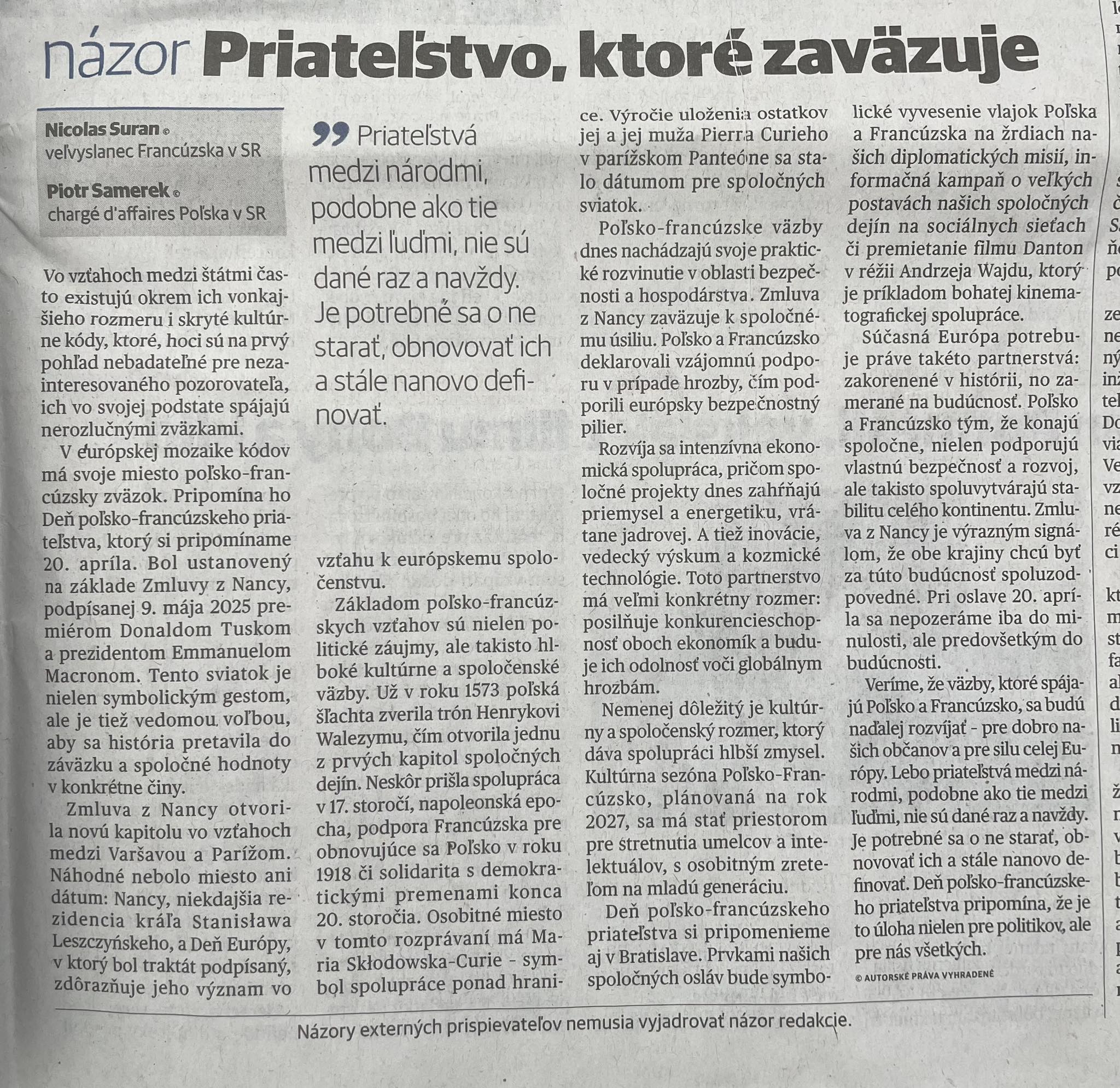 20. apríla sa po prvýkrát oslavoval Deň poľsko-francúzskeho priateľstva, ustanovený na základe Zmluvy o posilnenej spolupráci a priateľstve, podpísanej 9. mája 2025 v Nancy. Voľba tohto dátumu má symbolický rozmer - pripomína uloženie pozostatkov Marie Skłodowskej-Curie a Pierra Curie v parížskom Pantéone, čím sa zdôrazňuje osobitný charakter spoločného vedeckého a kultúrneho, ale aj historického dedičstva Poľska a Francúzska.