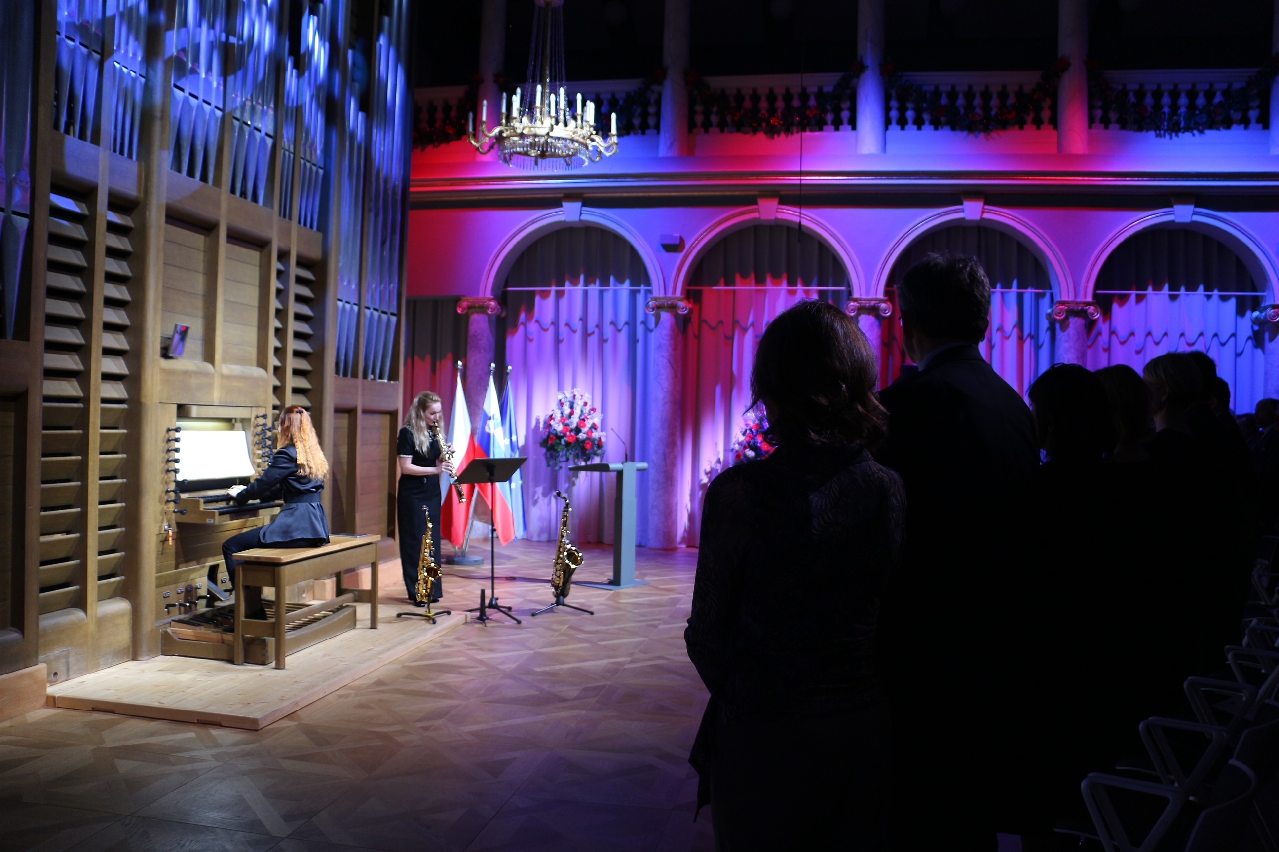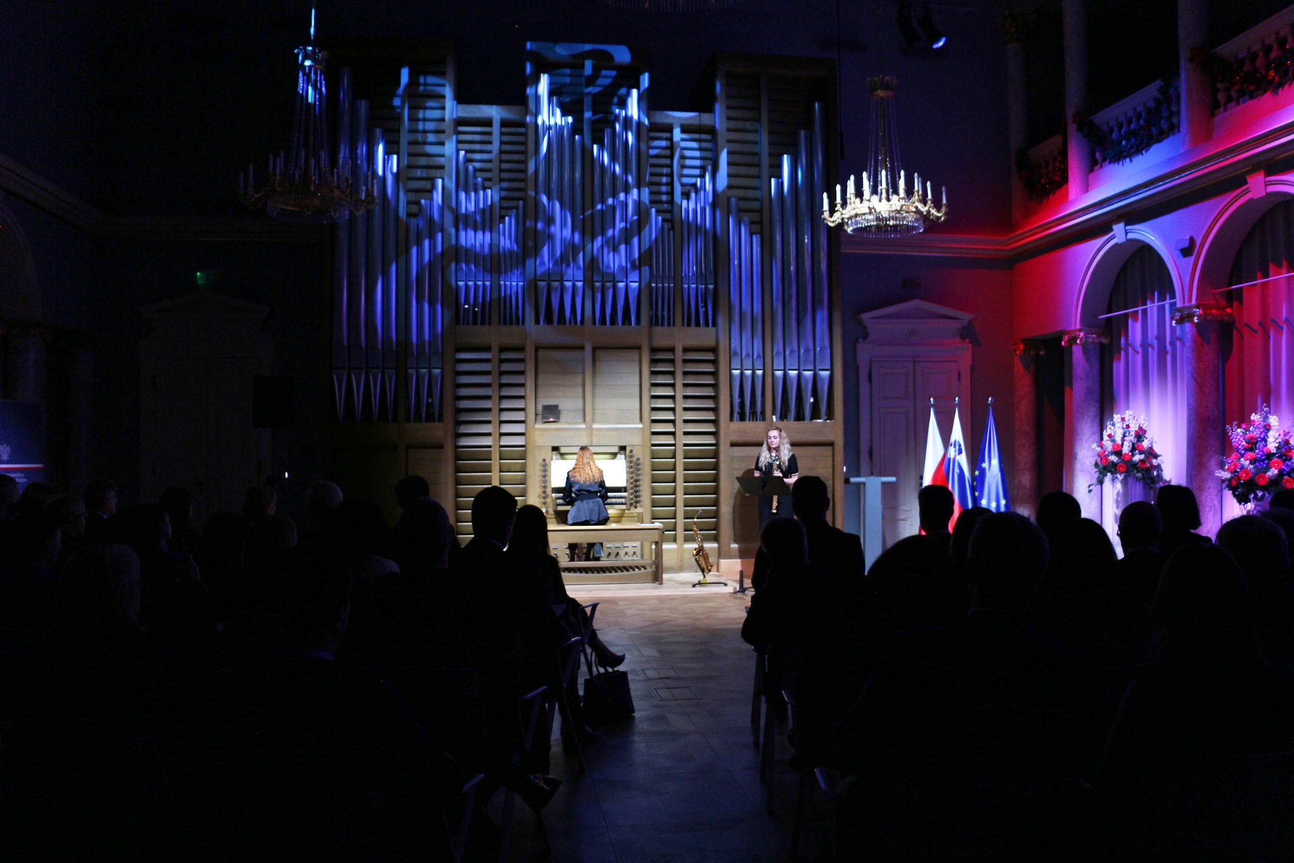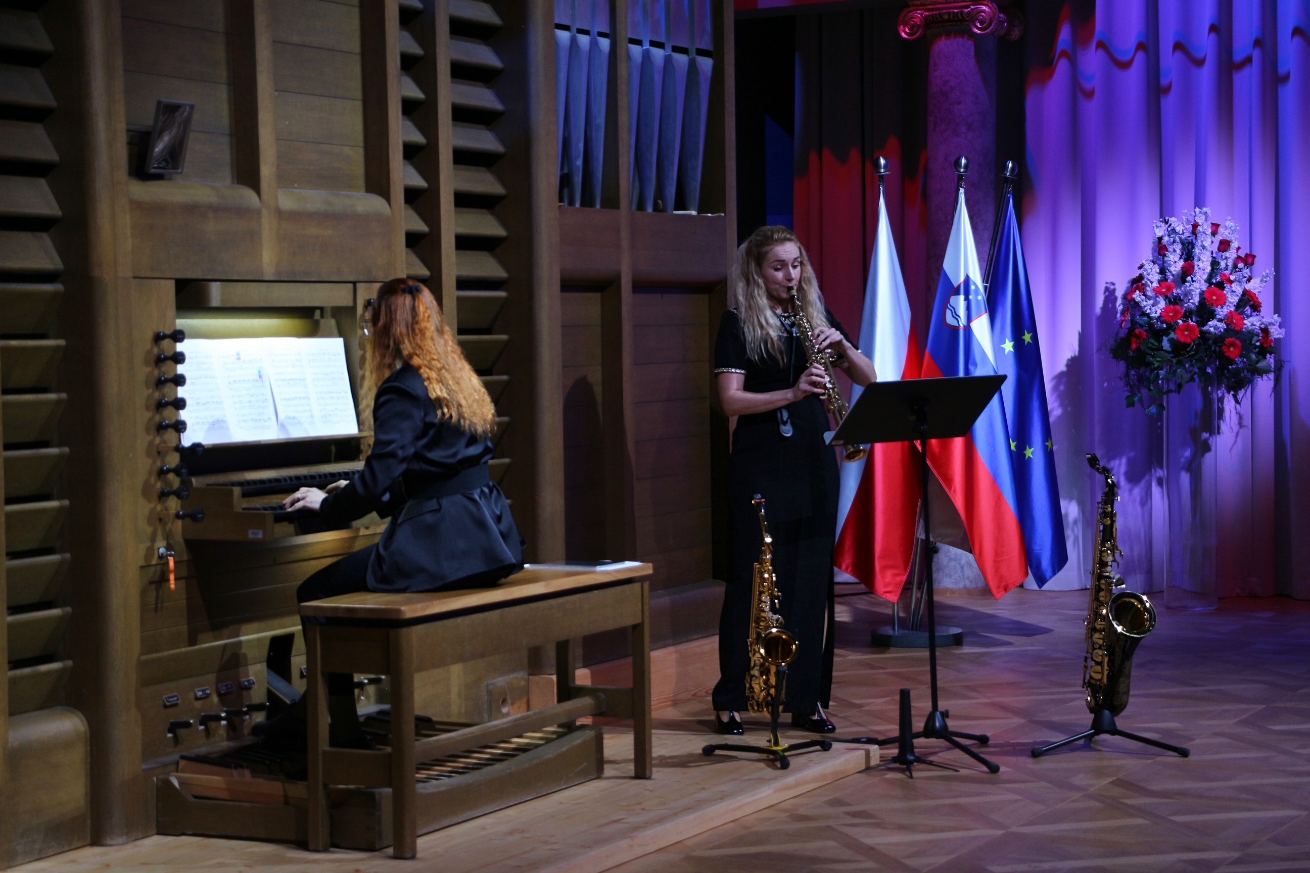 Po krótkim wprowadzeniu mia艂 miejsce polsko-s艂owe艅skiego koncert duetu Aerofonia, w sk艂adzie: Weronika Partyka (saksofon) i Tjaša Drovenik Adamec (organy). Artystki okre艣laj膮 swoj膮 wspó艂prac臋 jako unikalne po艂膮czenie dwóch instrumentów, które 艂膮czy ekspresyjne ciep艂o saksofonu z majestatycznym rezonansem organów. W艣ród zaprezentowanych przez Aerofoni臋 utworów znalaz艂y si臋 wspó艂czesne utwory polskich kompozytorów – 艁ukasza Wosia, Mariana Sawy i Mi艂owa Bembinowa, a tak偶e aran偶acje klasyków – Johanna Sebastiana Bacha oraz Hansa-André Stamma. Publiczno艣膰 by艂a zachwycona mistrzowskimi interpretacjami, które przenosi艂y w niezwyk艂y 艣wiat muzyki. Organowe frazy, pe艂ne dostoje艅stwa i powagi, doskonale wspó艂gra艂y z mi臋kkim, czasami melancholijnym tonem saksofonu. Artystki, dzi臋ki swojej wyj膮tkowej synergii, zdo艂a艂y wywo艂a膰 g艂臋bokie emocje w艣ród zgromadzonych, oferuj膮c niezapomniane do艣wiadczenie muzyczne. Dzi臋ki przemy艣lanemu repertuarowi go艣cie mogli podziwia膰 efekty owocnej polsko-s艂owe艅skiej wspó艂pracy oraz przede wszystkim, mieli okazj臋 by zapozna膰 si臋 z twórczo艣ci膮 wspó艂czesnych polskich kompozytorów.