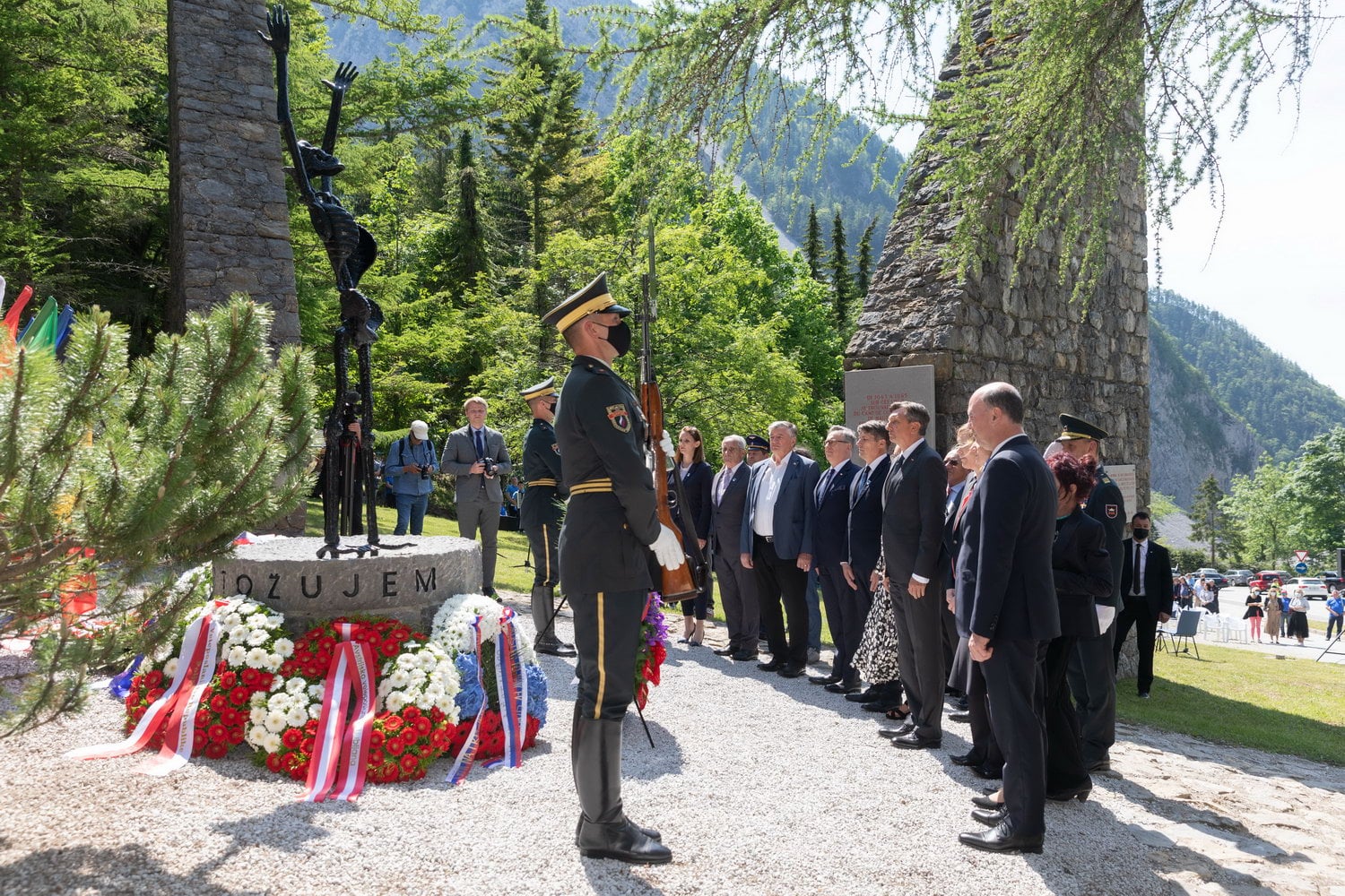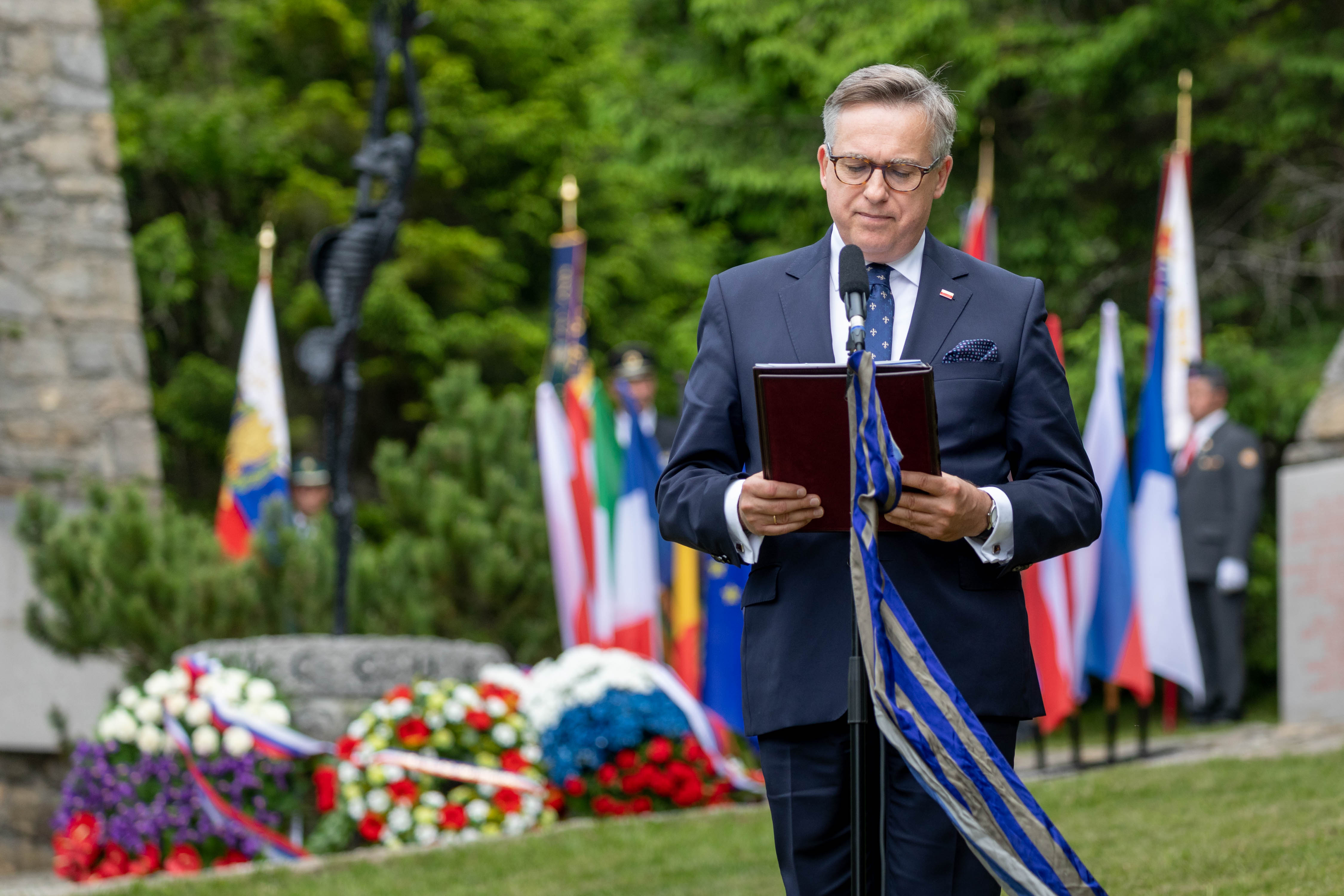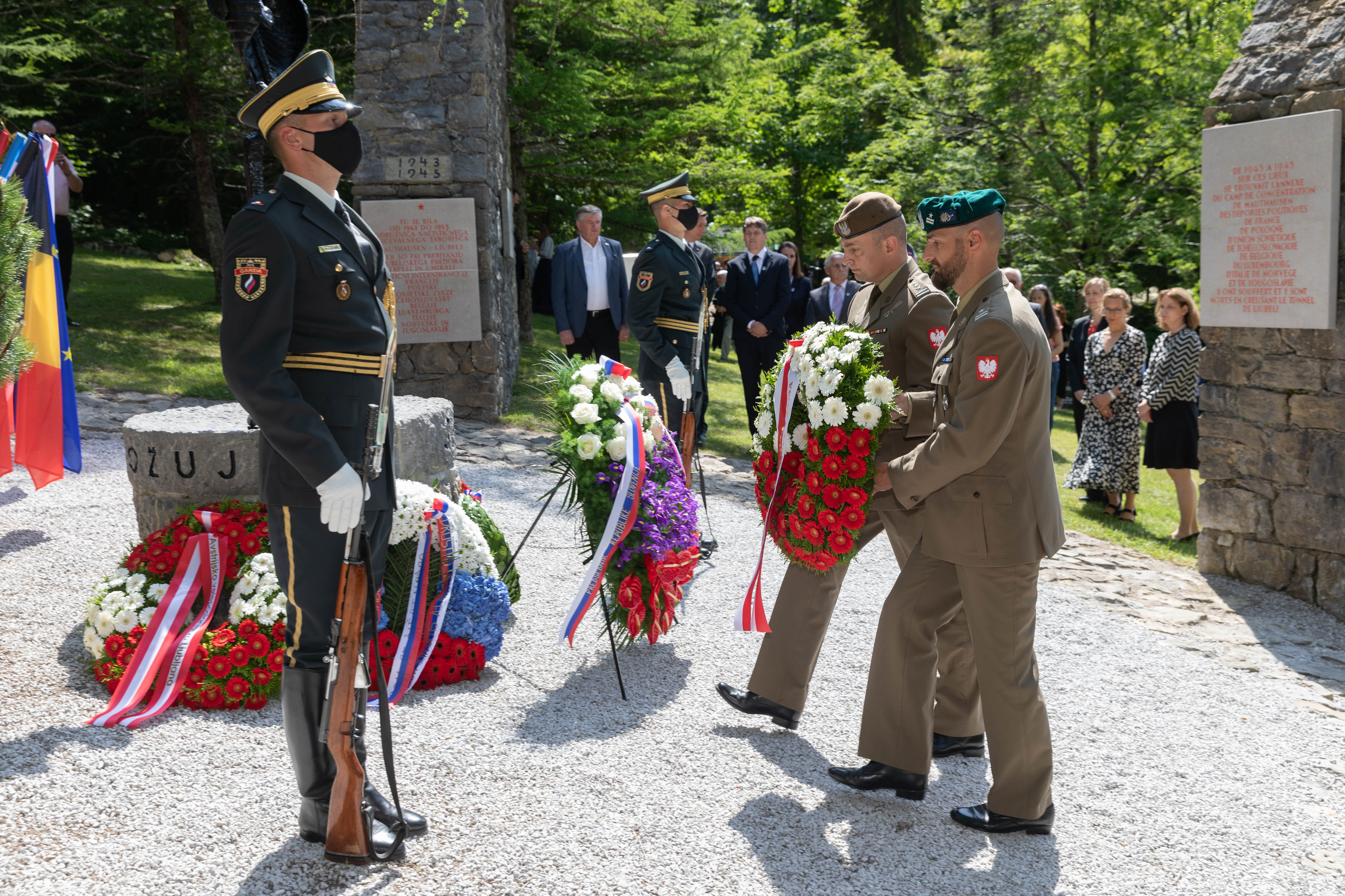 Ambasador Krzysztof Olendzki wraz z Attaché Obrony pułkownikiem Krzysztofem Makarewiczem i majorem Marcinem Lesiem z NATO MW COE złożyli wieniec pod pomnikiem "J’accuse" upamiętniającym ofiary niemieckiego nazistowskiego obozu koncentracyjnego w Ljubelj podczas uroczystości w 76. rocznicę wyzwolenia obozu.