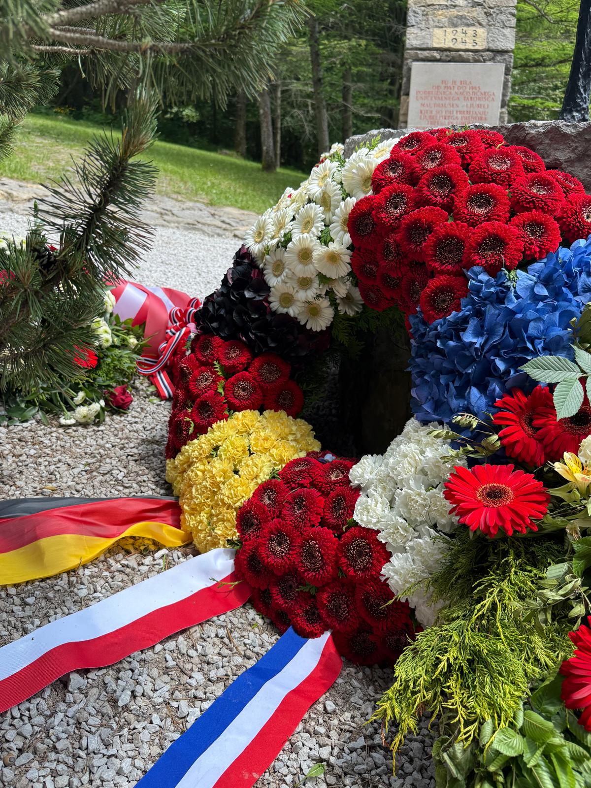 Chargé d'affaires Ambasady RP w Słowenii Łukasz Paprotny wraz z ambasadorami Niemiec i Francji złożył wspólny wieniec w kolorach narodowych Polski, Francji i Niemiec podczas uroczystości upamiętniających 80. rocznicę wyzwolenia niemieckiego nazistowskiego obozu zagłady w Ljubelj, filii obozu Mauthausen Gusen.
