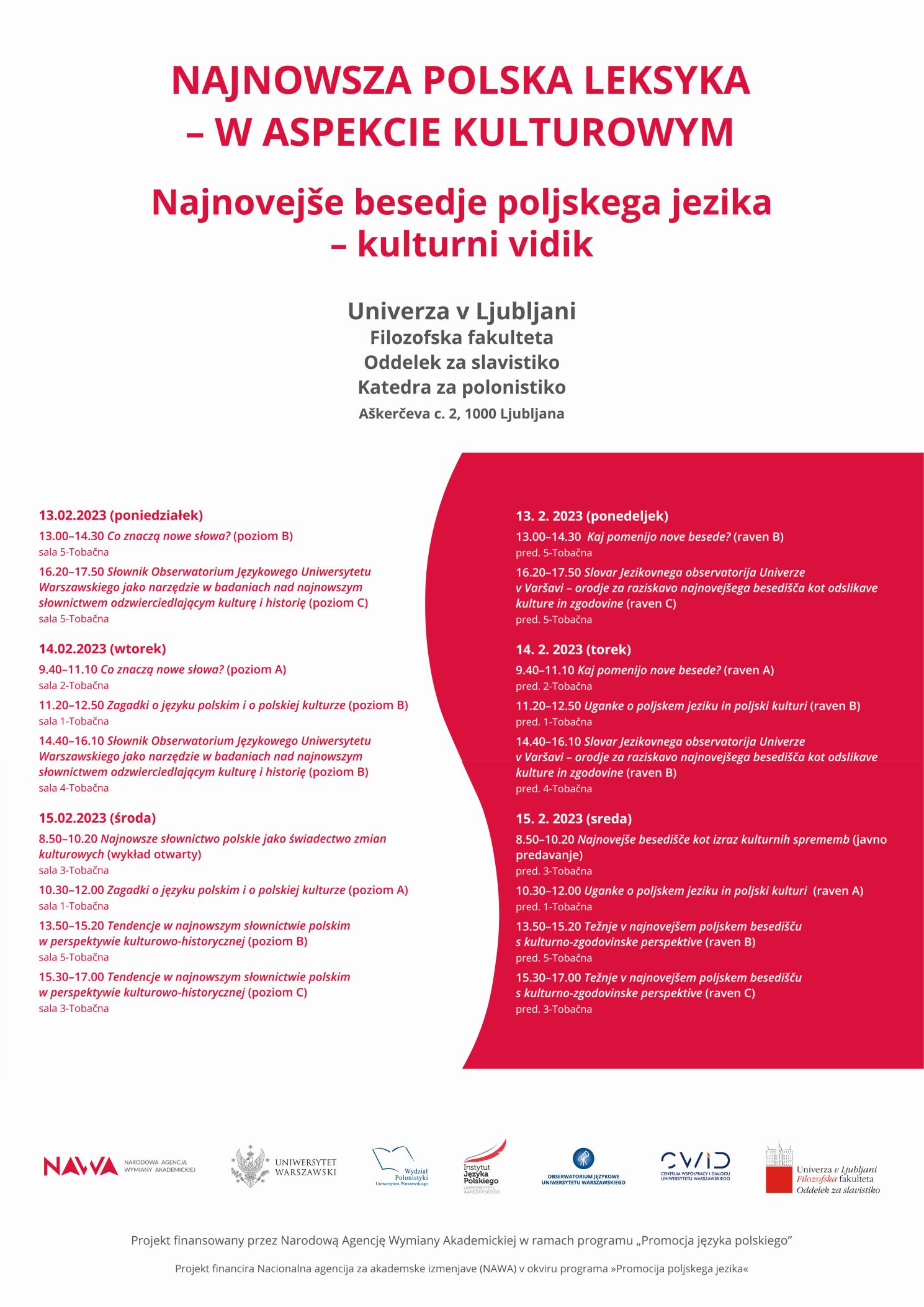 Katedra Polonistyki Wydziału Filozoficznego Uniwersytetu Lublańskiego serdecznie zaprasza na warsztaty i wykłady w ramach projektu „Najnowsza polska leksyka – w aspekcie kulturowym”, które odbędą się od poniedziałku 13 lutego do środy 15 lutego 2023 w Instytucie Slawistyki Wydziału Filozoficznego Uniwersytetu w Lublanie przy ul. Tobačnej 5 w Tygodniu Otwartych Drzwi FF UL i Roku Języków – Jezikava FF. Więcej...