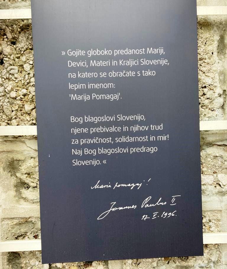 Joanna Olendzka: Naszą misję w Słowenii rozpoczęliśmy od zawierzenia się Matce Bożej Wspomożycielce Wiernych właśnie w Sanktuarium w Brezje. Przyjechałam do Słowenii 23 maja, a dokładnie następnego dnia obchodzono w Brezje Święto patronalne Sanktuarium, więc postanowiliśmy od razu tu przyjechać. Wiem, że w życiu nie ma przypadków. Ten pierwszy dzień mojego pobytu w Słowenii spędzony właśnie w Brezje związał nas od razu nierozerwalnie z Marija Pomagaj. Bywamy tu bardzo często. To przecudne miejsce, przepełnione duchem modlitwy. Ojcowie Franciszkanie uczynili z Brezje prawdziwą oazę „pokoju i dobra”. W Sanktuarium w Brezje znajdują się relikwie św. Jana Pawła II, stoi tam też jego pomnik z szeroko rozłożonymi ramionami na tle panoramy majestatycznych Alp Julijskich, z którego Jan Paweł II zdaje się wołać: Bóg Cię kocha, Słowenio!