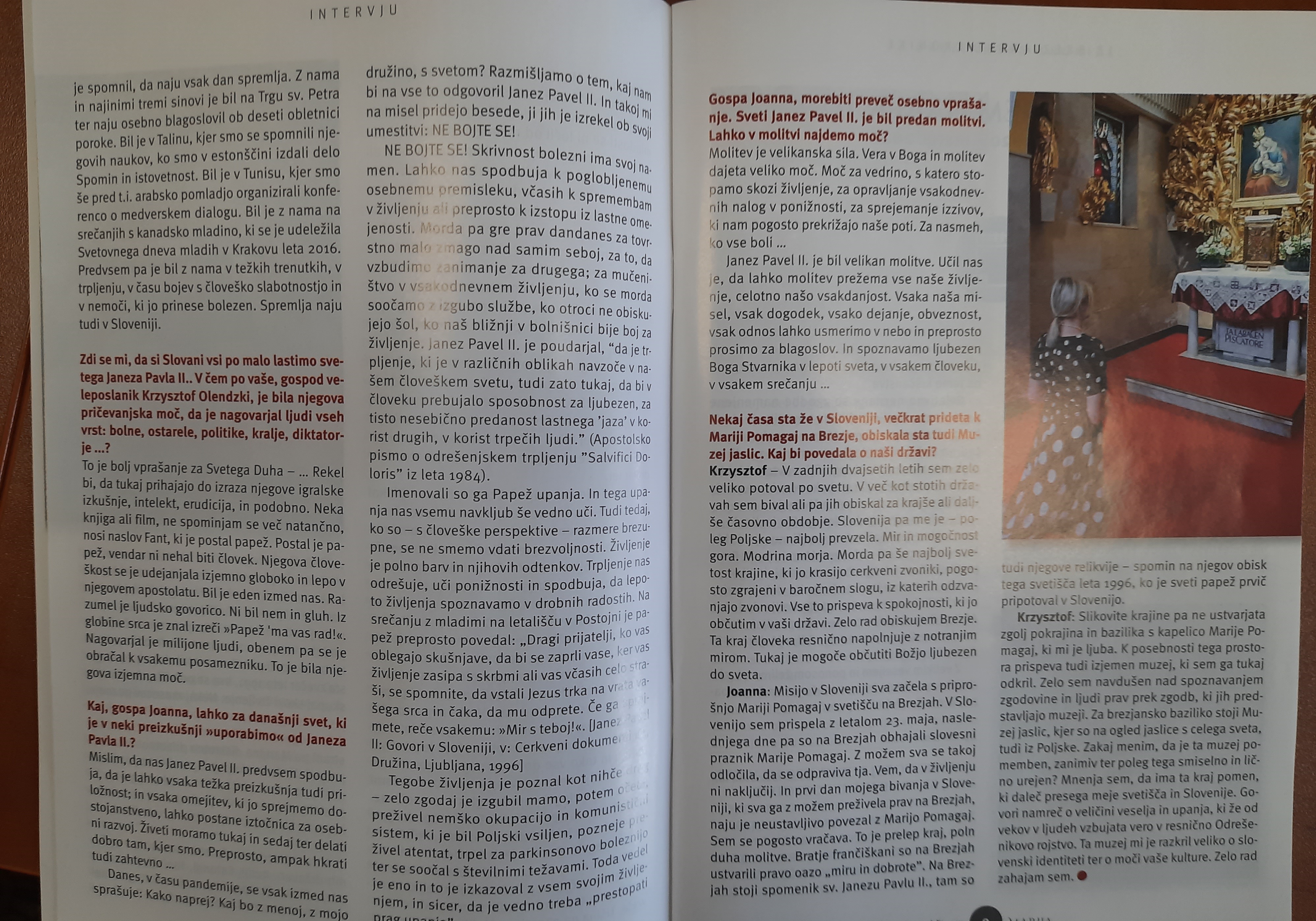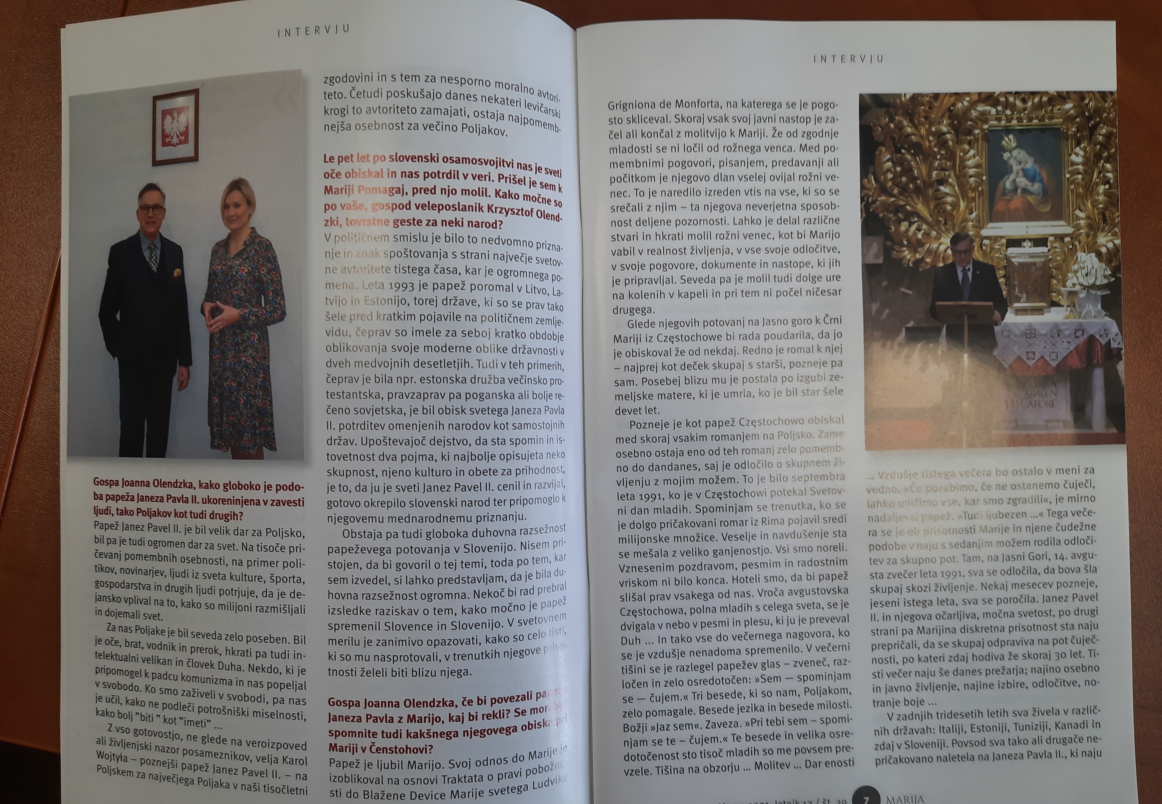 Wywiad z Joanną i Krzysztofem Olendzkimi ukazał się z okazji 25. rocznicy pierwszej pielgrzymki Jana Pawła II do Słowenii. Papież odwiedził Słowenię dwukrotnie: w maju 1996 roku i we wrześniu 1999 roku.