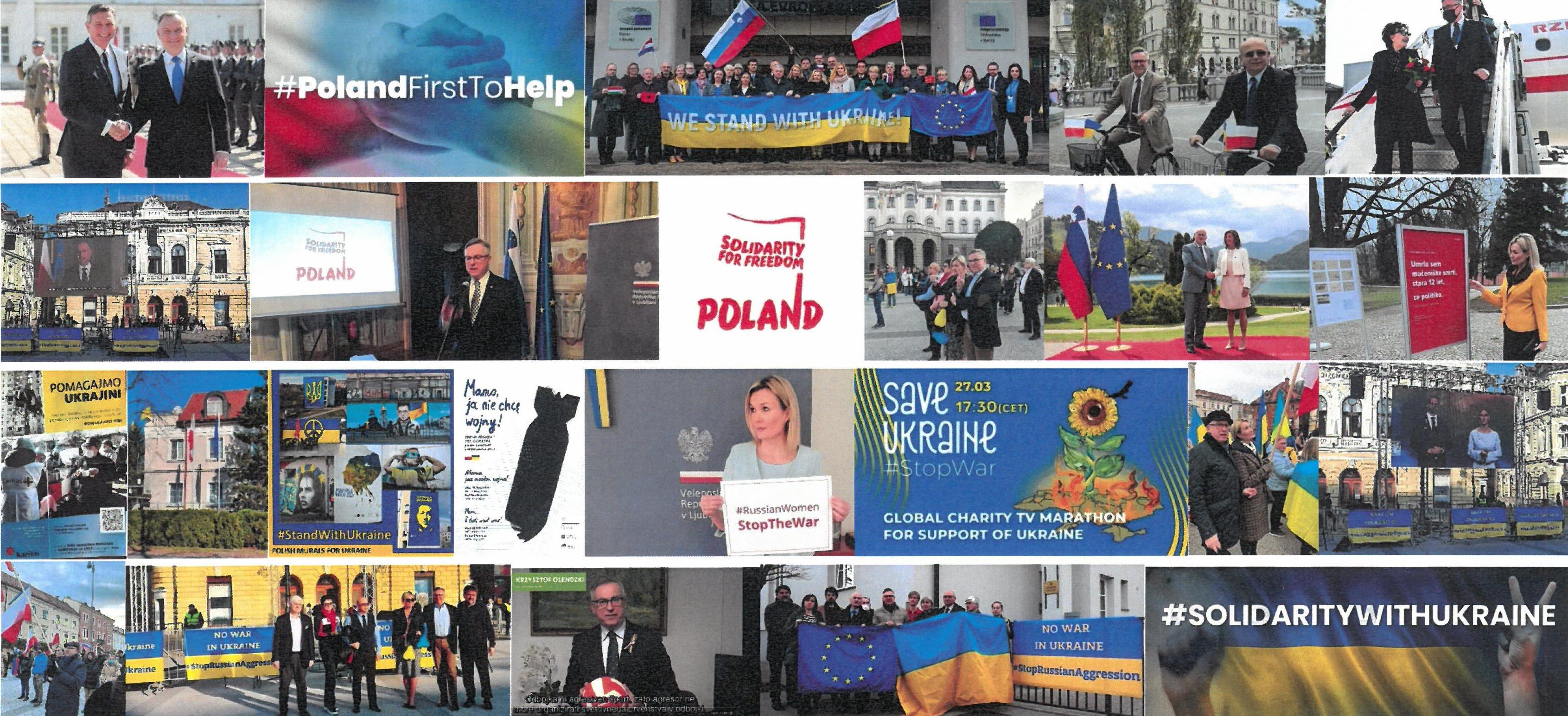 Od pierwszych dni wojny Ambasada RP w Lublanie organizowała lub współorganizowała marsze, koncerty, pokazy filmów, konferencje prasowe, ale także nabożeństwa na rzecz pokoju w Ukrainie. Koordynowała zbiórki charytatywne oraz pomoc słoweńskich lekarzy. Włączała się w akcje solidarności z Ukrainą - m.in. wyklejanie okien, inicjatywę pań pt. ”rosyjskie kobiety zatrzymajcie wojnę”, transmisje charytatywnych koncertów dla Ukrainy z Warszawy na centralnym placu Lublany. Podejmowała wielorakie działania przeciwko rosyjskiej dezinformacji. W wielu przypadkach ściśle współpracowała z Ambasadą Ukrainy w Słowenii.