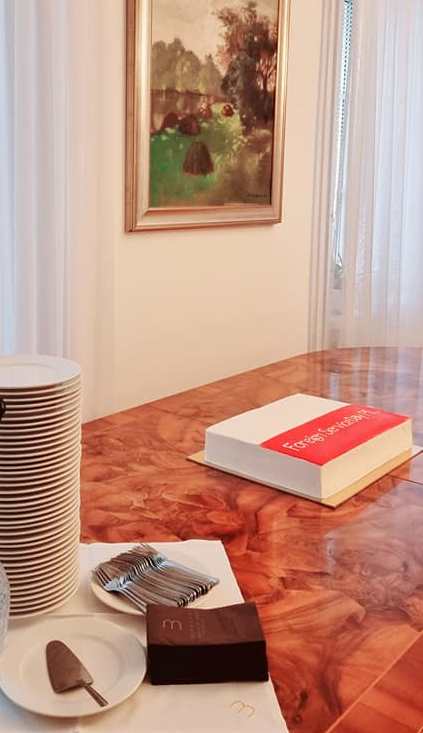 Po wzniesieniu toastu, pokrojono tort, specjalnie przygotowany na Dzień Polskiej Służby Zagranicznej w Słowenii. Po życzeniach i gratulacjach goście przemieścili się przed budynek Ambasady, gdzie Ambasador Olendzki otworzył wystawę o historii hymnu polskiego.