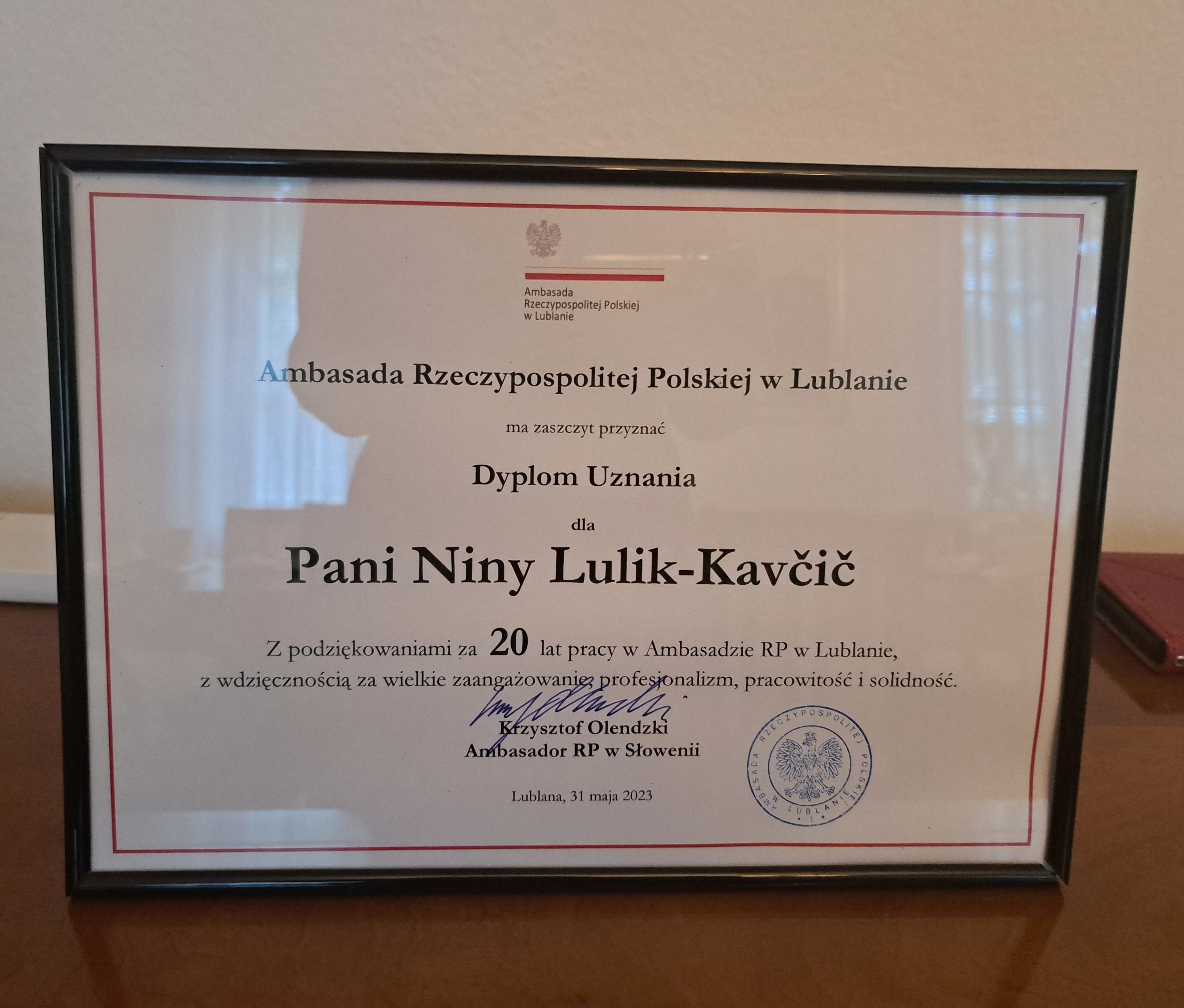 20 lat temu p. Nina Lulik-Kavčič rozpoczęła pracę w Ambasadzie RP w Lublanie na stanowisku tłumacza. Dziękujemy Pani Ninie za te wszystkie lata poświęcone pracy na rzecz umacniania relacji polsko-słoweńskich. Jesteśmy wdzięczni za jej profesjonalizm, zaangażowanie i solidność. Życzymy Ninie dalszych owocnych lat pracy oraz wszelkiej pomyślności w życiu osobistym i zawodowym.