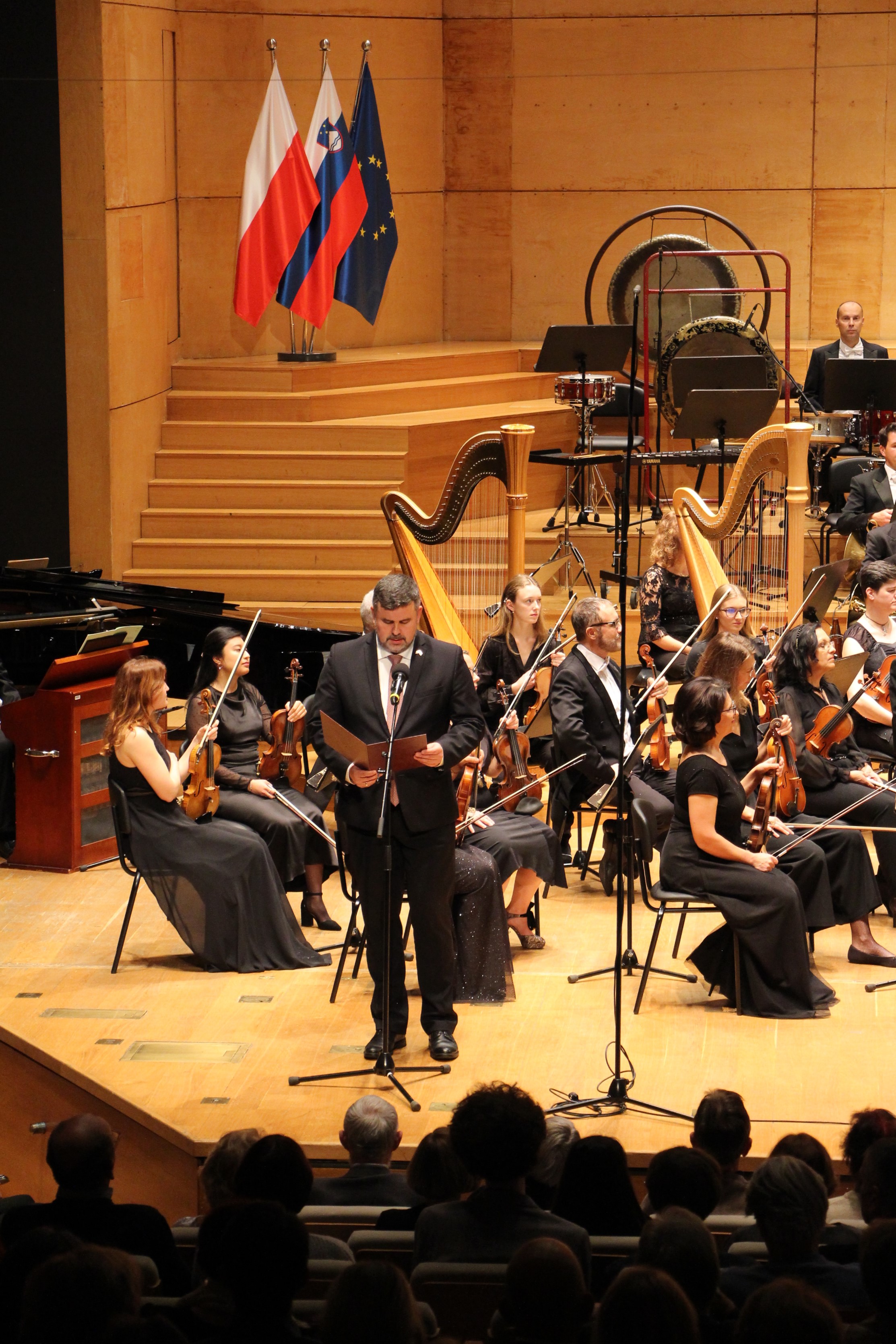 Wieczór rozpoczął się przemówieniem chargé d’affaires Ambasady RP w Słowenii Łukasza Paprotnego, który wymienił okazje, które uświetnia koncert, podkreślił znaczenie solidarności między Polską a Słowenią w kontekście międzynarodowych wyzwań, zwrócił uwagę na oczekujące ją zadania w związku z zbliżającą się prezydencją. Podkreślił również wagę współpracy i wsparcia dla broniącej się od ponad 1000 dni Ukrainy.
