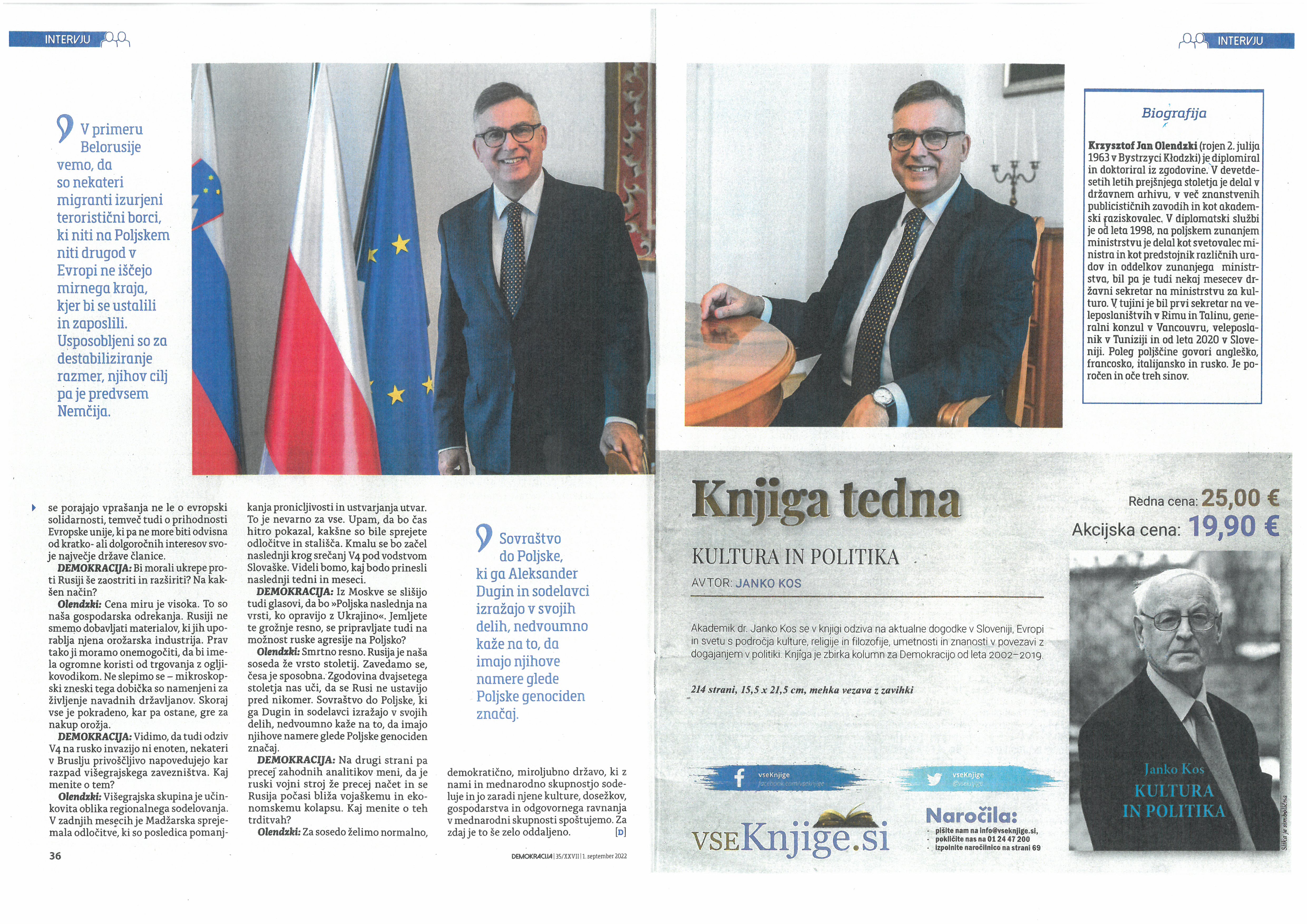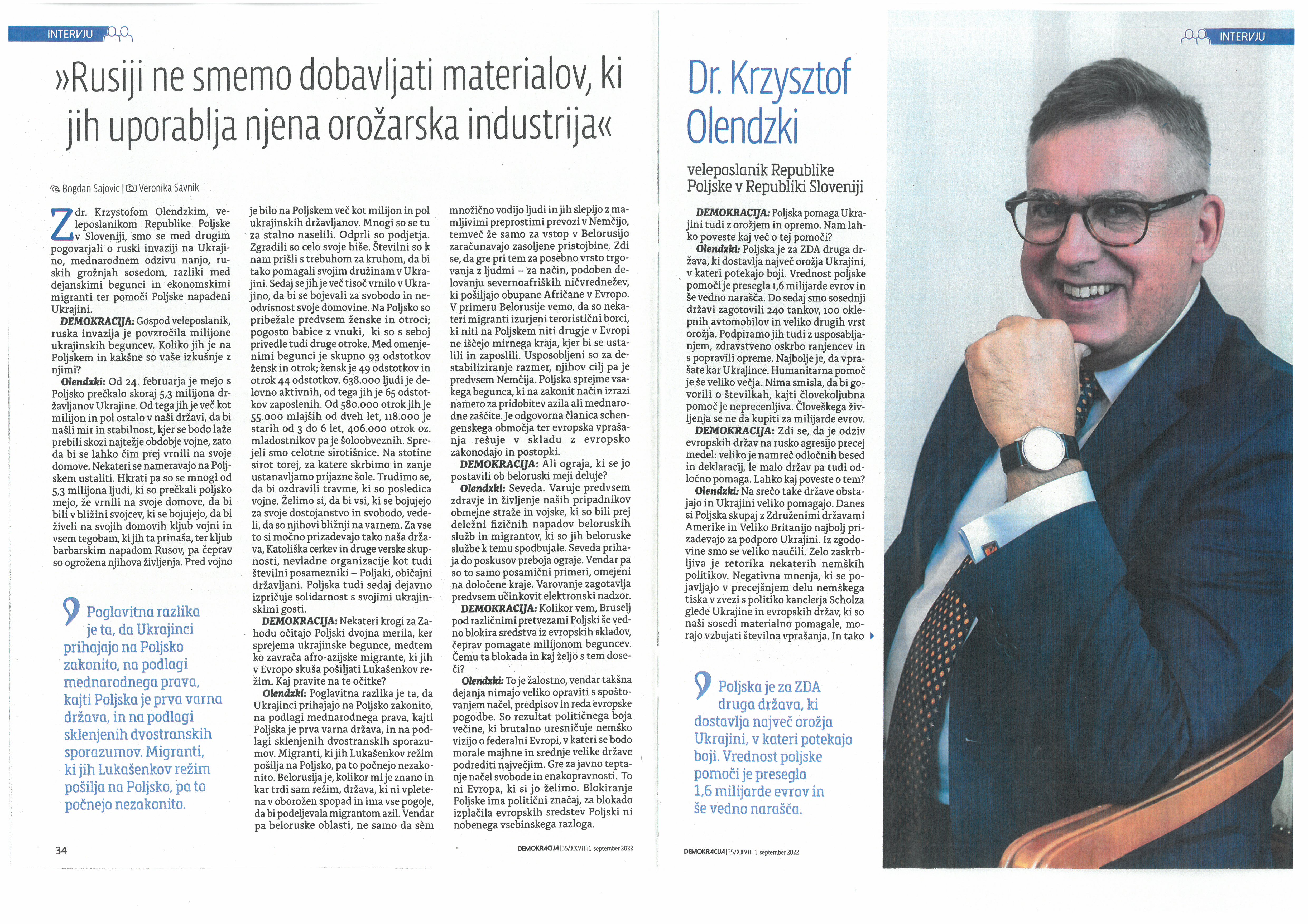 Poniżej przedstawiamy fragmenty wywiadu, jakiego Ambasador RP w Słowenii Krzysztof Olendzki udzielił Bogdan Sajovicovi na temat rosyjskiej agresji na Ukrainę oraz zaangażowania Polski we wsparcie Ukrainy. Wywiad ukazał się w Tygodniku Demokracija w dniu 83. rocznicy wybuchu II wojny światowej.