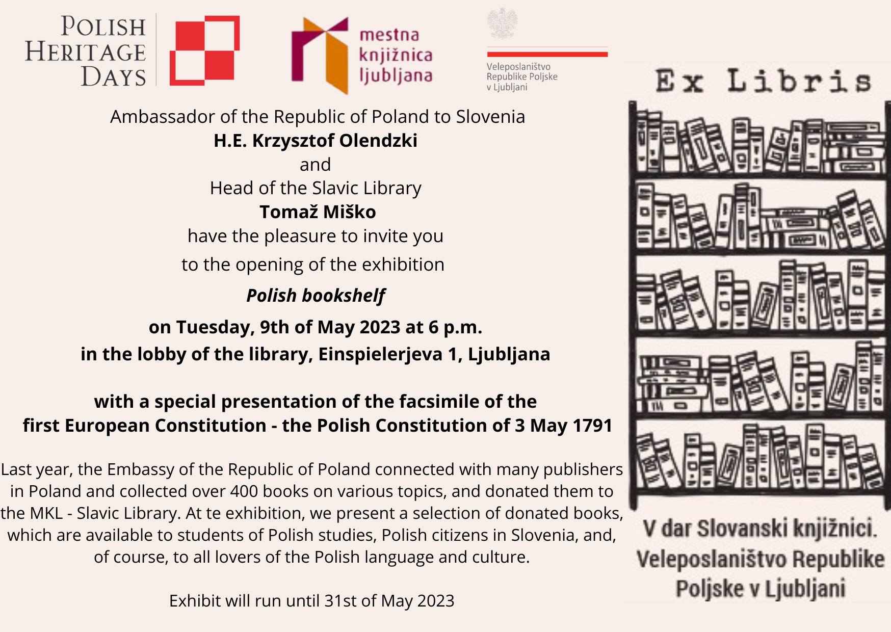 W ramach Polish Heritage Days / Dni Polskiego Dziedzictwa w Słowenii 9 maja 2023 r. w Bibliotece Słowiańskiej w Lublanie odbyła się inauguracja wystawy „Knjižno okno na Poljsko"/ "Polish Bookshelf"/ "Regał z polskimi książkami” prezentująca polskie książki przekazane Bibliotece przez Ambasadę RP w Lublanie, a ofiarowane przez polskie wydawnictwa. Była to zarazem inauguracja nowopowstałego Działu Polonia Biblioteki Słowiańskiej w Lublanie.