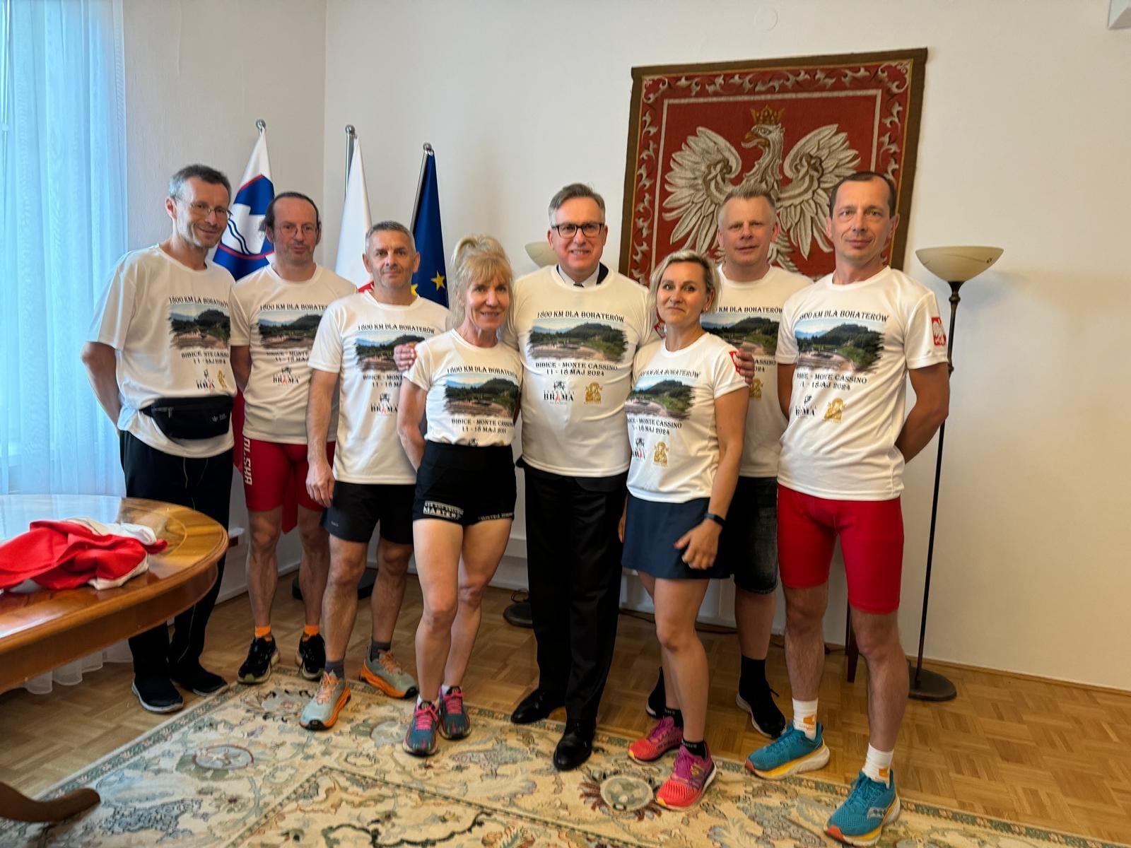 Z okazji zbliżającej się 80. rocznicy Bitwy pod Monte Cassino mieliśmy radość gościć w naszej Ambasadzie sztafetę biegaczy z Polski zmierzających na uroczystości rocznicowe do Włoch. "Jestem emocjonalnie związany z ideą tego biegu. Choć sam już nie mogę w Wami pobiec, jestem niezwykle wdzięczny że Waszym wysiłkiem upamiętniacie tych, którzy dali Polsce wszystko, co mieli" - powiedział podczas spotkania z Montecassińczykami Ambasador Krzysztof Olendzki.