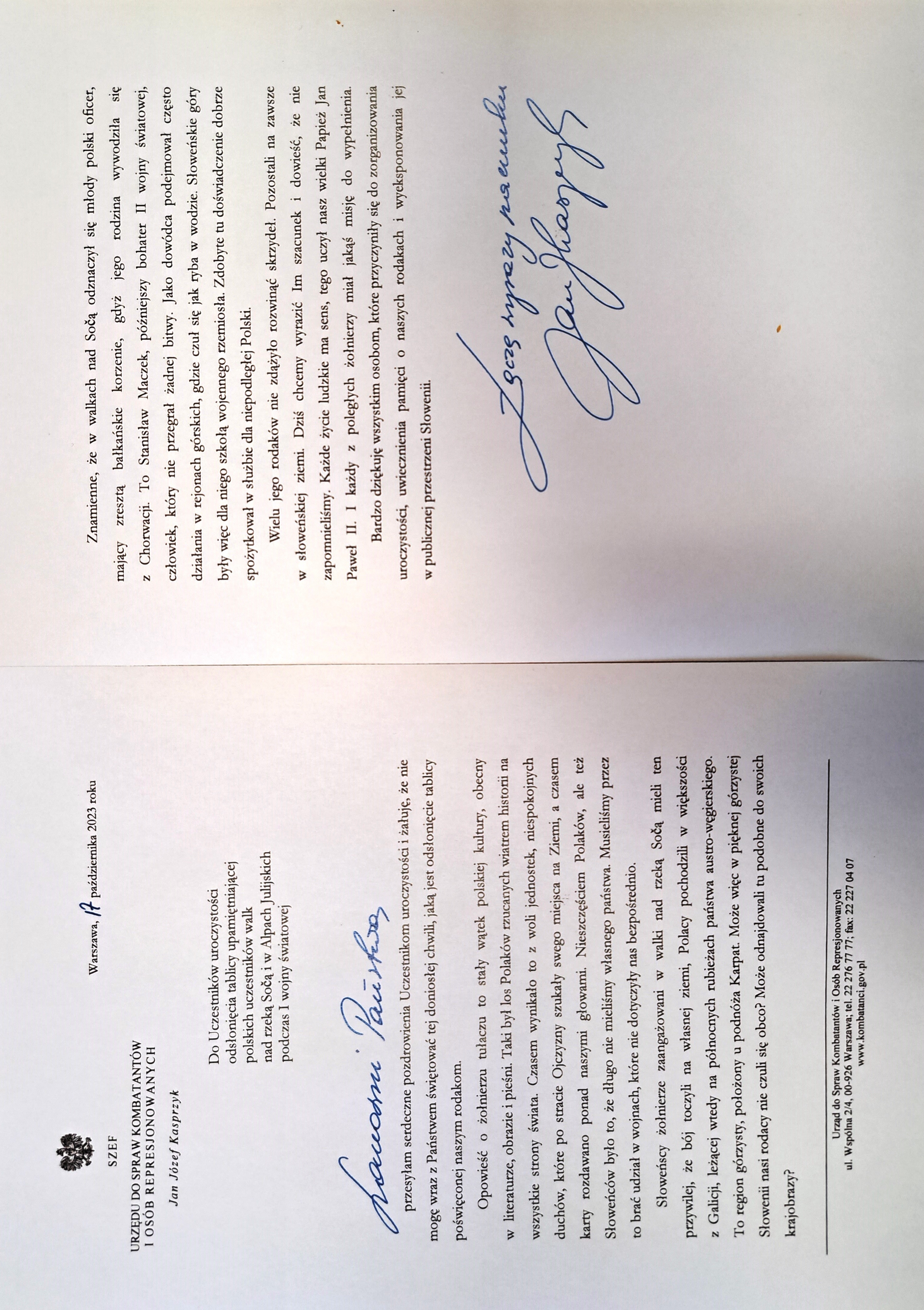 W swym przemówieniu Ambasador RP podkreślił, że w walkach na froncie Soczy zginęło, zostało rannych i zaginionych ponad milion żołnierzy. Zbyt wielu Polaków znalazło swój ostatni dom na słoweńskiej ziemi. Zakończenie Wielkiej Wojny przyniosło Polsce długo oczekiwaną niepodległość, o której marzyła. Setki tysięcy Polaków, którzy walczyli w Armii Cesarsko-Królewskiej i po niej wrócili do ojczyzny, swoim bogatym doświadczeniem i umiejętnościami przywódczymi wyniesionymi z walk na polach bitew Wielkiej Wojny przyczynili się do obrony granic państwa. Jednym z nich był służący w austriackim pułku strzelców alpejskich późniejszy prekursor polskiej broni pancernej gen. Stanisław Maczek. Ambasador przypomniał, iż część pułków galicyjskich była w większości dwunarodowa: polsko – ukraińska. To tu po raz pierwszy doszło do efektywnego braterstwa broni i krwi Polaków i Ukraińców, zaprzepaszczonego następnie w XX wieku. Podkreślił też, iż w dniu dzisiejszym Polska pomagała i będzie pomagać Ukrainie, aż do jej ostatecznego zwycięstwa w wojnie z rosyjskim najeźdźcą. Odniósł się także do rozwijanej przez Polaków i Słoweńców kultury pamięci, której wyrazem jest opieka nad grobami żołnierzy z I wojny światowej: polskimi przez Słoweńców oraz słoweńskimi przez Polaków.