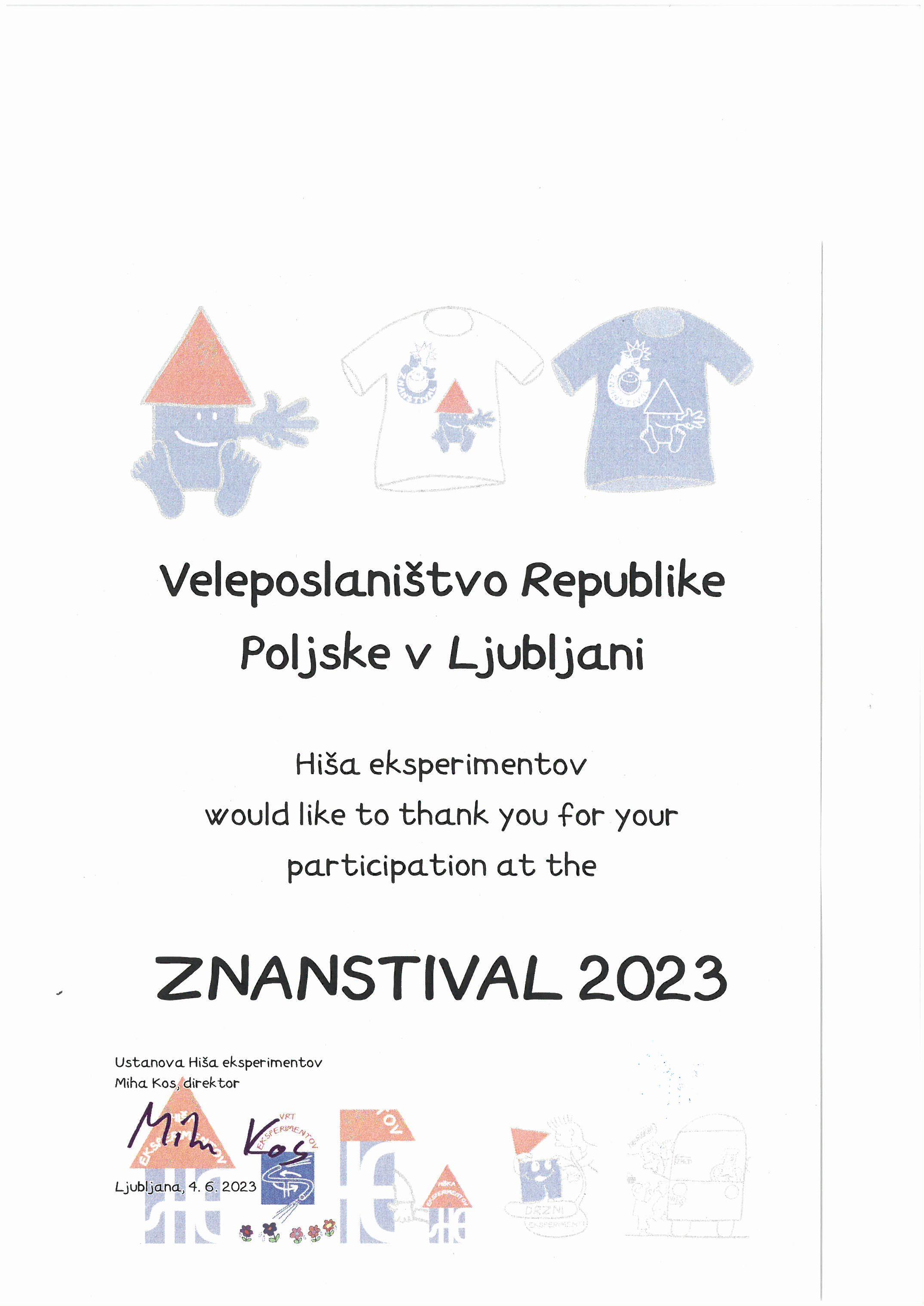 Znanstival to wielkie święto nauki, które odbywa się corocznie od 14 lat. Podczas piknniku popularyzatorzy z całego świata organizują liczne pokazy, warsztaty, dyskusje i spotkania, łącznie aż 130 wydarzeń, w których uczestniczyło w tym roku 22 animatorów z 9 krajów. Tegoroczną edycję swoim patronatem objęła przewodnicząca Zgromadzenia Narodowego Pani Urska Klakocar Zupancic.