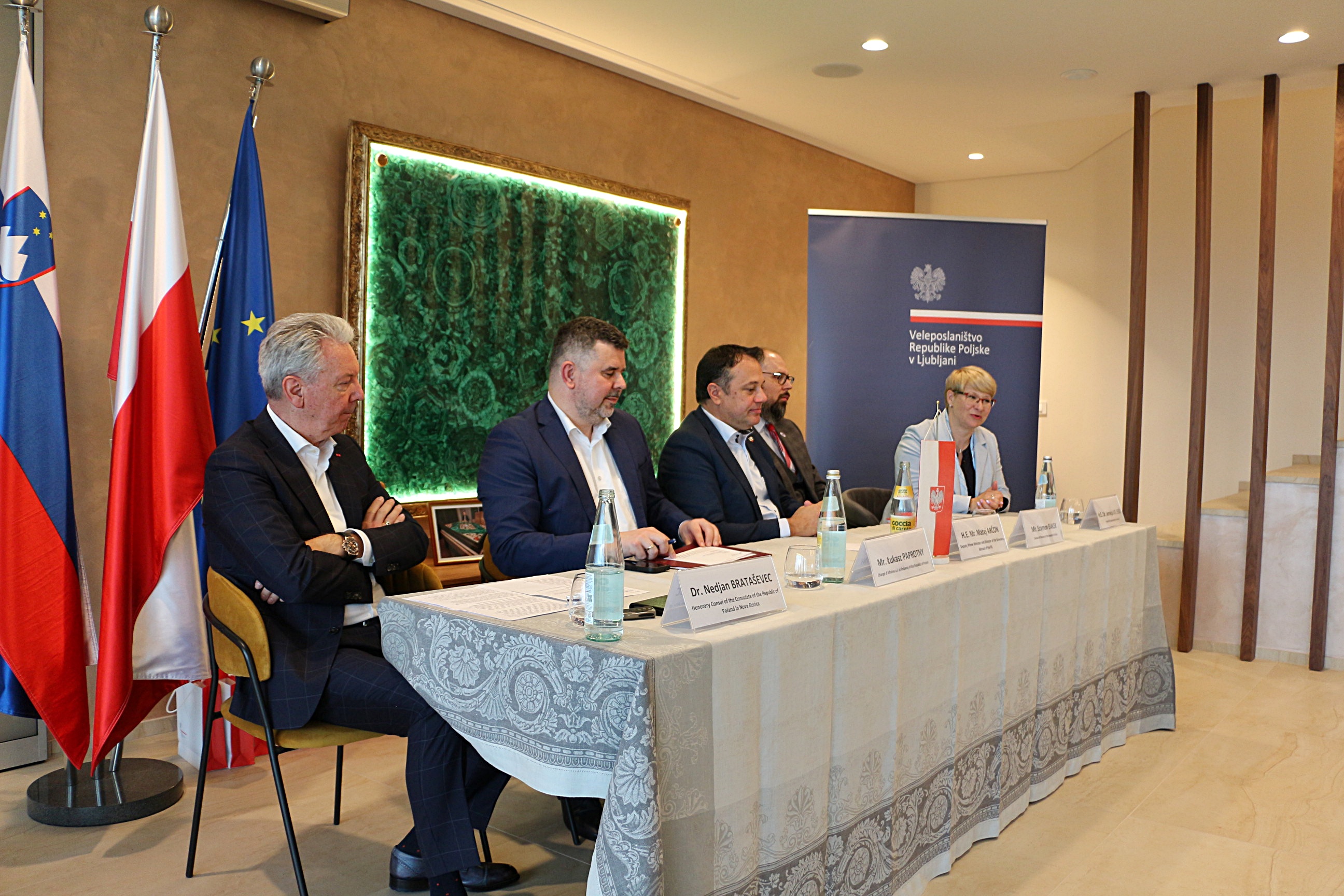 Region Goriška Brda położony przy granicy słoweńsko-włoskiej słynie z uprawy winorośli, czereśni i oliwek. Dzięki partnerstwu Ambasady RP w Lublanie i Konsula Honorowego RP w Nowej Goricy Nedjana Brataševca z instytucjami lokalnymi, zachodnia Słowenia jest miejscem współpracy polsko-słoweńskiej, ważnej także w kontekście sprawowania w r. 2025 przez Nową Goricę wraz z Gorycją funkcji Europejskiej Stolicy Kultury. Witając zebranych, chargé d’affaires RP pan Łukasz Paprotny zaprezentował obecność Polski w regionie na przykładzie inicjatyw gospodarczych, kulturalnych i związanych z ochroną i promocją miejsc pamięci wzdłuż frontu nad Soczą (Isonzo) w I wojnie światowej. Głównym prelegentem był wicepremier Republiki Słowenii pan Matej Arčon, rzecznik rządu i minister ds. autochtonicznej ludności słoweńskiej w krajach ościennych oraz stosunków między Słowenią, a słoweńską diasporą na świecie, były wieloletni burmistrz Nowej Goricy, odznaczony w 2018 r. odznaką honorową Bene Merito przyznaną przez Ministra SZ RP.