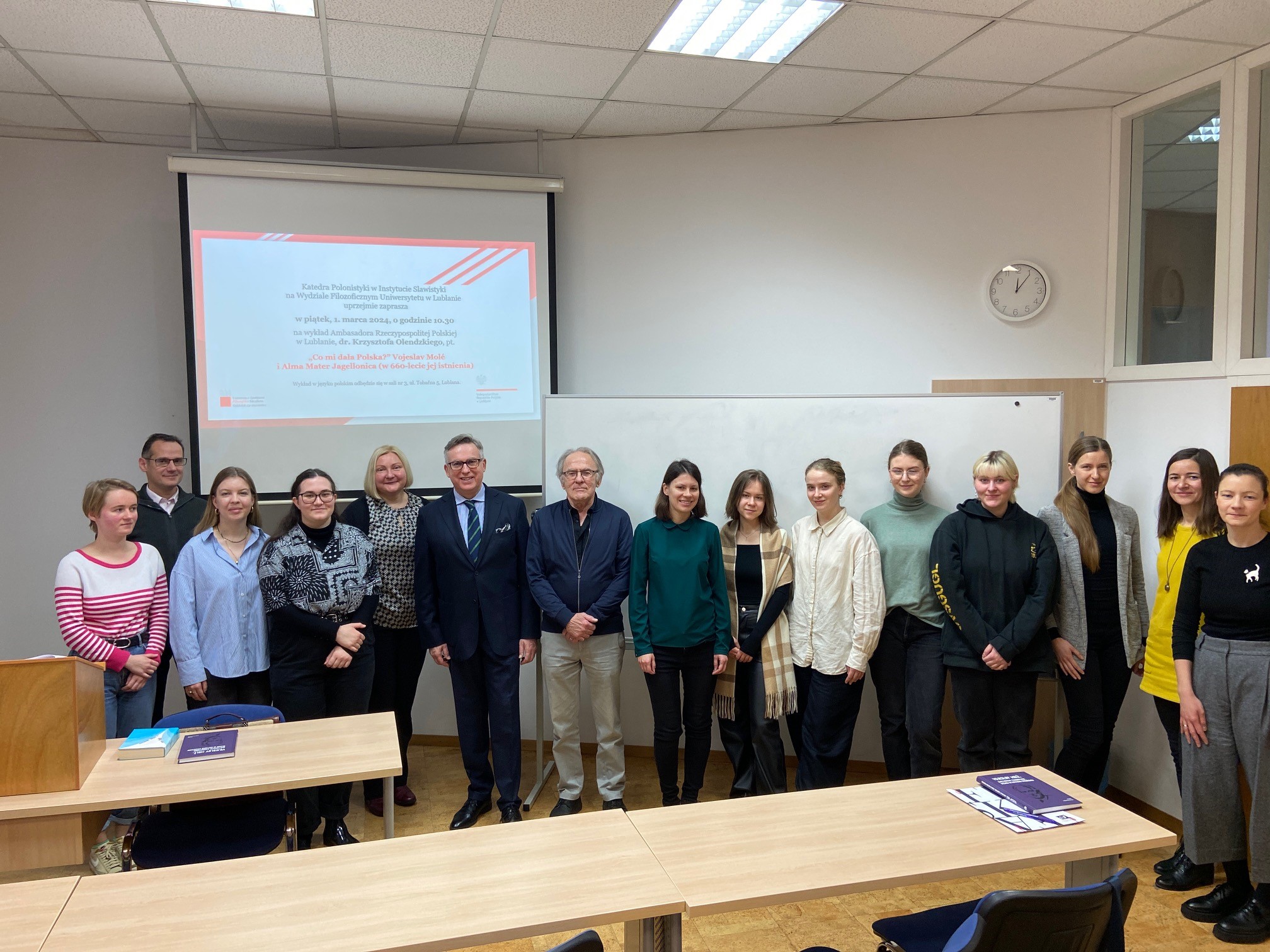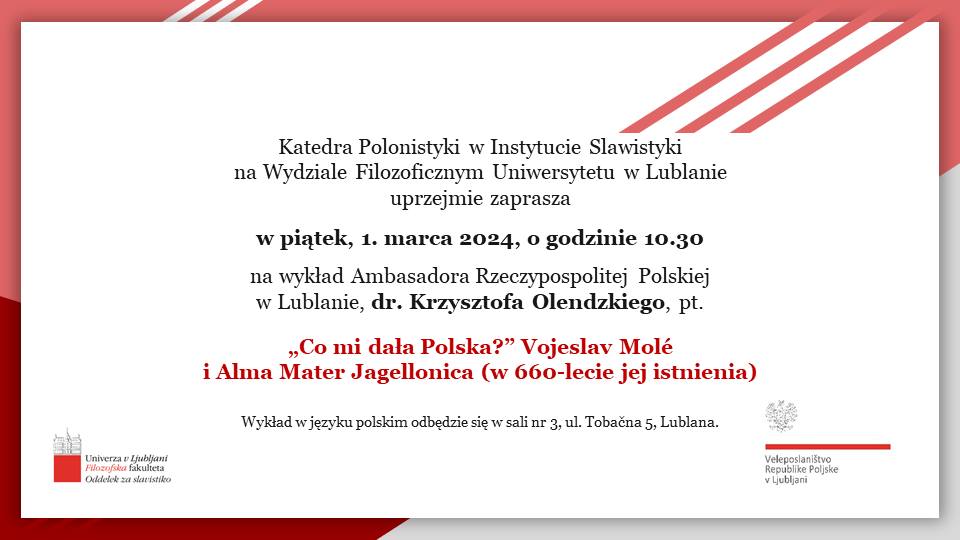 Wykład Ambasadora RP Krzysztofa Olendzkiego pt. "Co mi dała Polska – Vojesłav Mole i Alma Mater Jagiellonica w 660-lecie jej istnienia" dla wykładowców i studentów Katedry Polonistyki Uniwersytetu Lublańskiego i zaproszonych gości był niezwykłą opowieścią o historii najstarszej polskiej uczelni i związków Wojsława Mole, słoweńskiego profesora, historyka sztuki, poety i krytyka literackiego z tą instytucją.