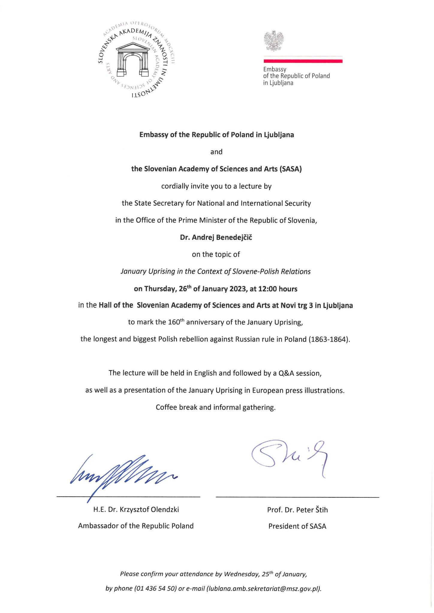 Zaproszenie na wydarzenie podpisali Ambasador RP oraz Prezes Słoweńskiej Akademii Nauk. SAZU udostępniła na tę okazję swoją główną salę.
