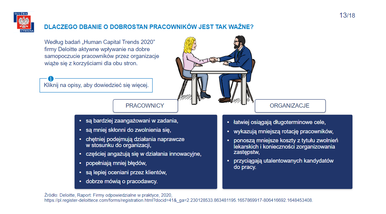 - Zdrowie w środowisku pracy – to kurs dla osób na stanowiskach kierowniczych i koordynujących w służbie cywilnej, które są zainteresowane pogłębieniem wiedzy, dzięki której będą mogły wpływać na budowanie przyjaznego środowiska pracy, a także przeciwdziałać negatywnym zjawiskom, takim jak stres, negatywne emocje w pracy i przeciążenie zadaniami.