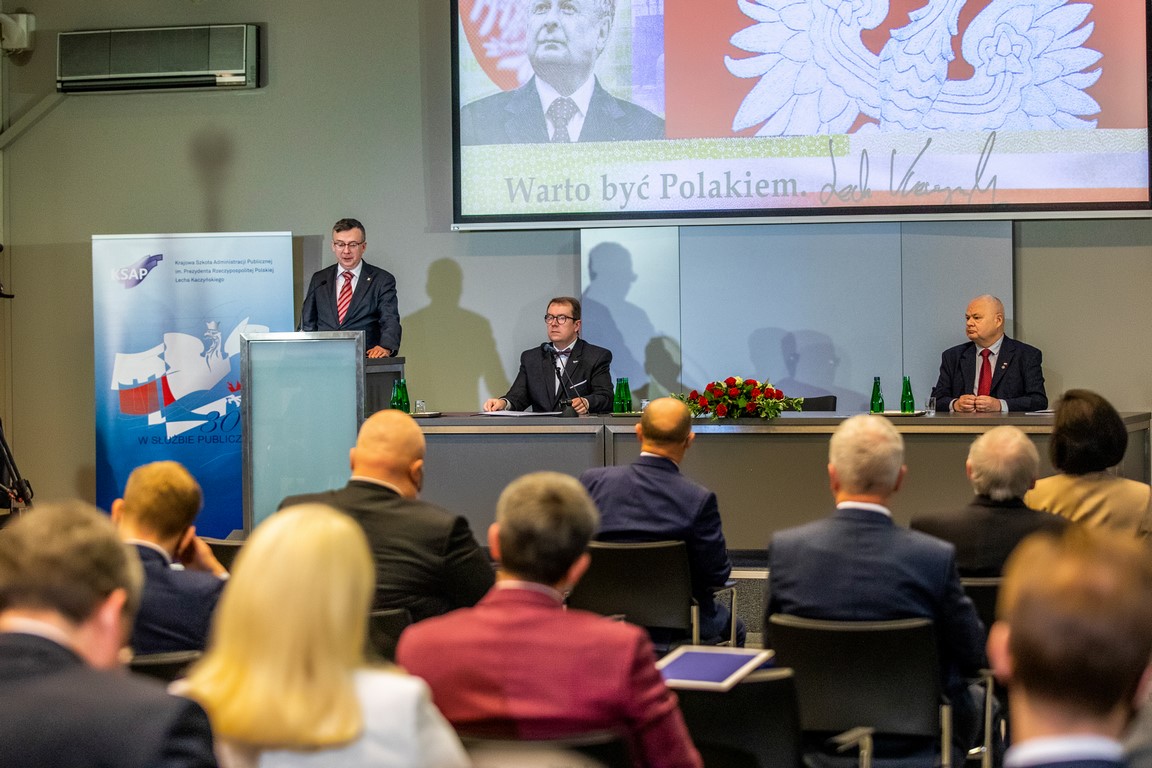 Następnie dyrektor KSAP dr Wojciech Federczyk odczytał list Prezesa Rady Ministrów Mateusza Morawieckiego. Premier przypomniał, że dokładnie trzydzieści lat temu, jesienią 1991 r.rozpoczęli naukę słuchacze pierwszej promocji Krajowej Szkoły. „Był to czas wielkich szans dla naszego narodu, ale i wyzwań, którym administracja publiczna musiała wyjść naprzeciw. To właśnie KSAP kształcił nowe kadry dla Polski. Do dziś dyplom tej szkoły to certyfikat najwyższego profesjonalizmu.” – dodał Premier.