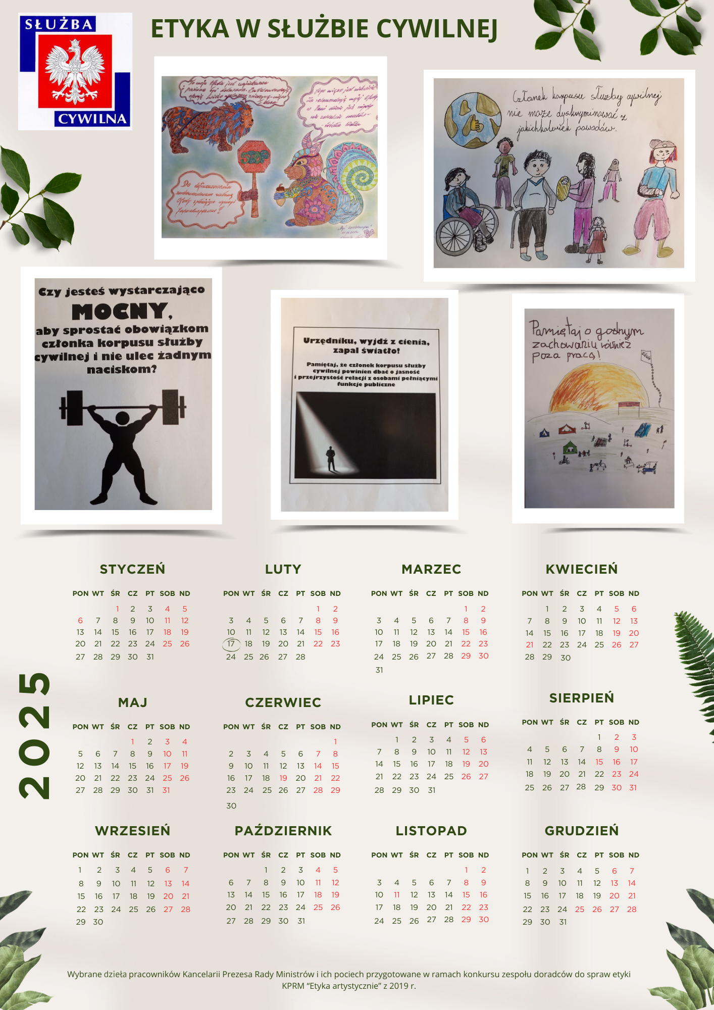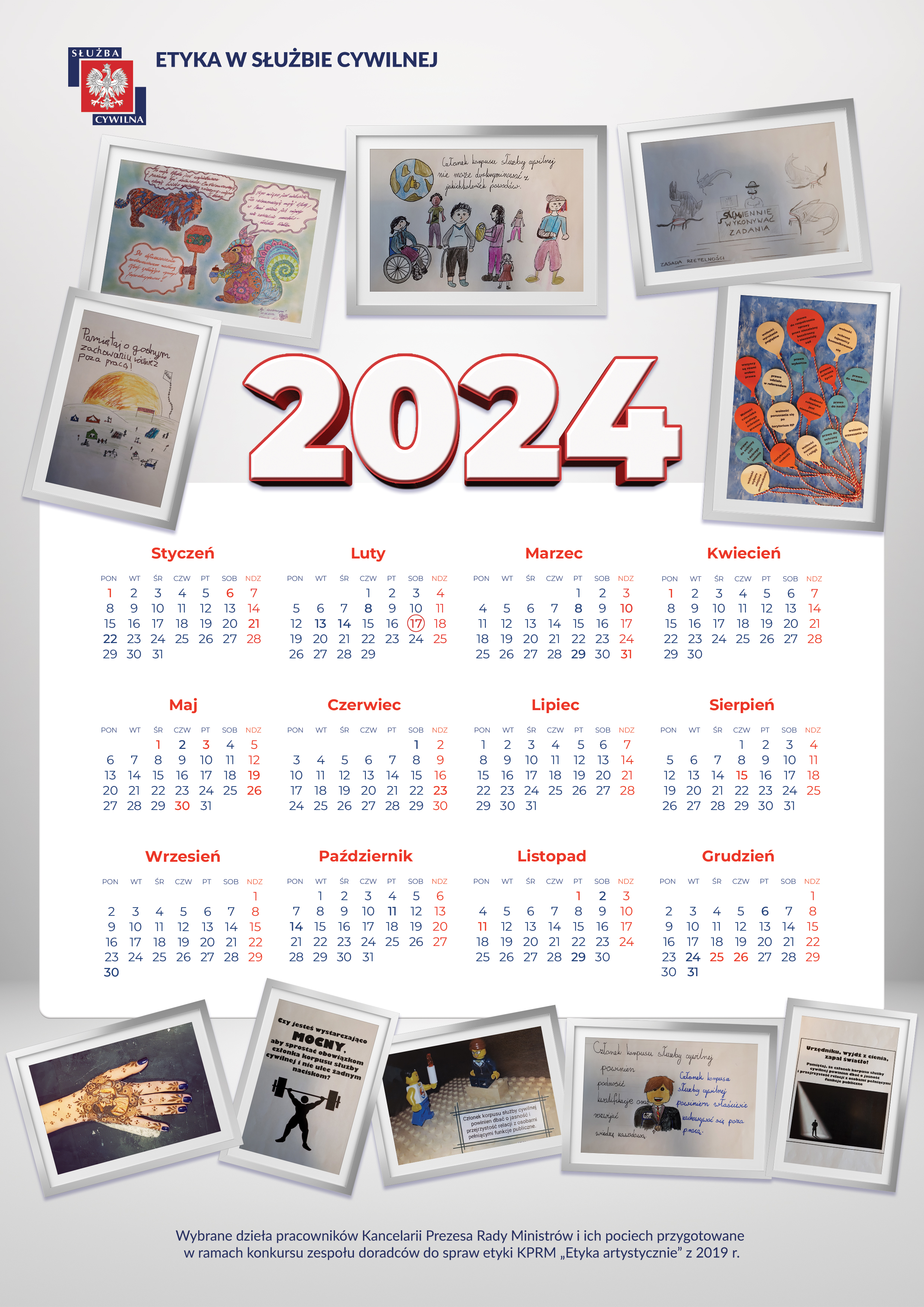 Udostępniamy Państwu projekty kalendarzy na 2024, 2025 i 2026 rok. Zawierają wybrane dzieła pracowników Kancelarii Prezesa Rady Ministrów (KPRM) i ich pociech, które były przygotowane w ramach konkursu „Zasady służby cywilnej i zasady etyki korpusu służby cywilnej oczami pracowników i ich rodzin”. Zespół doradców etycznych KPRM zorganizował go w 2019. Więcej o samym konkursie można przeczytać w zakładce „Dobre praktyki”.