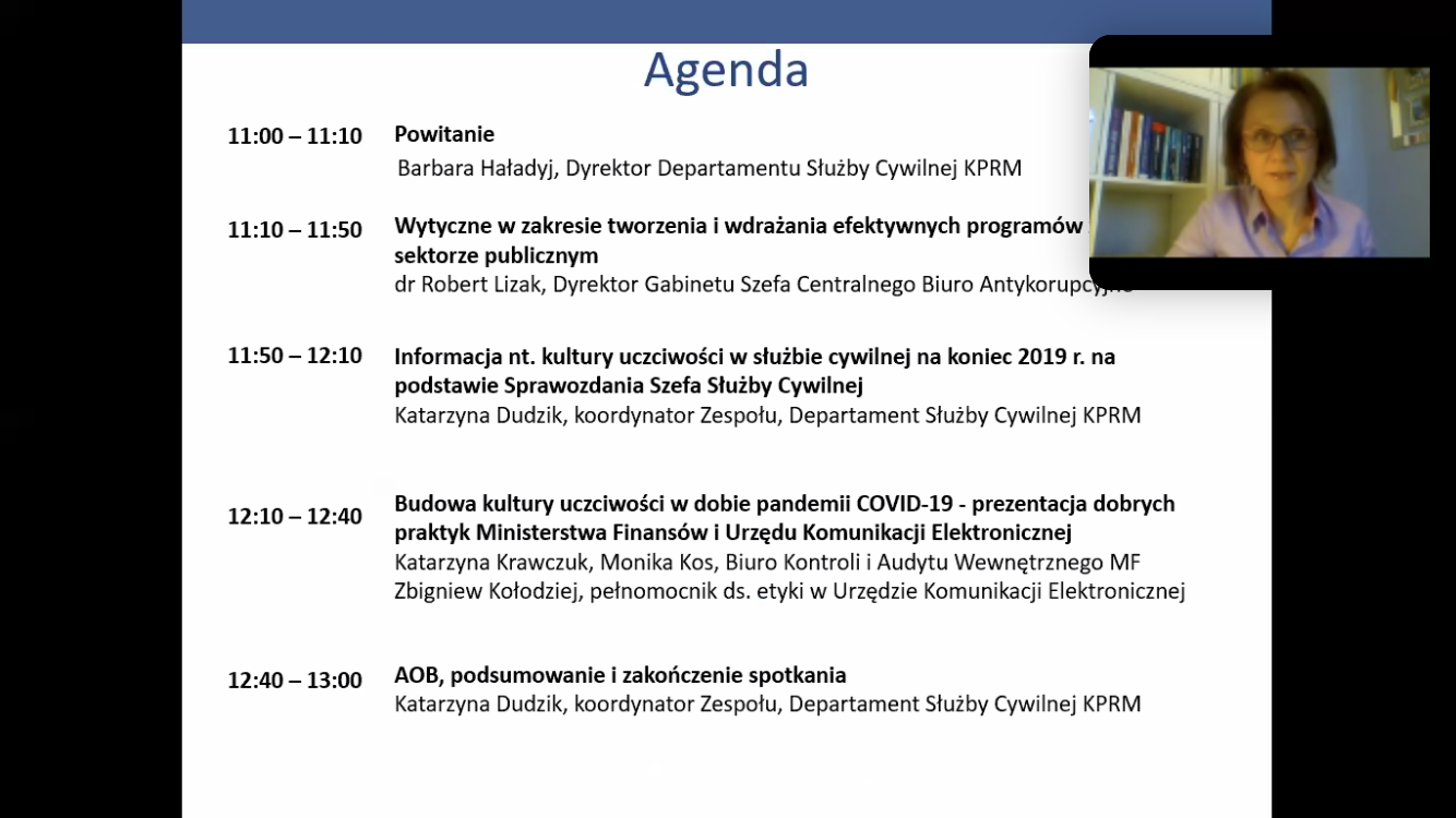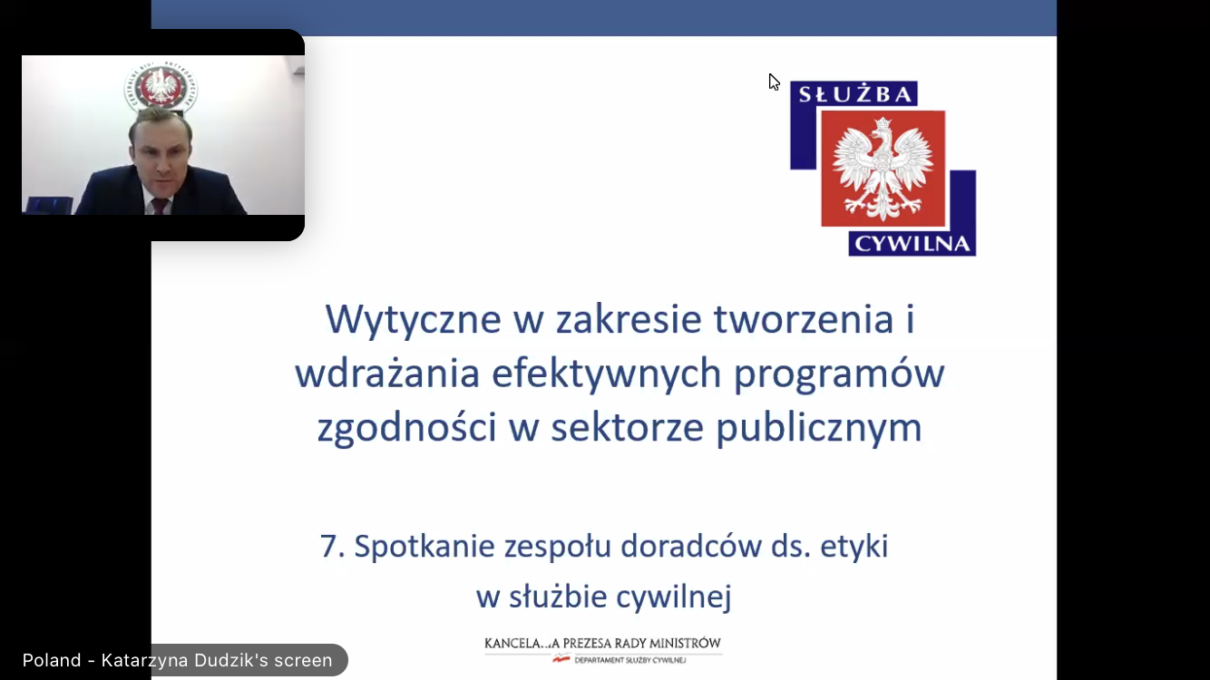 Spotkanie otworzyła dyrektor Departamentu Służby Cywilnej KPRM Barbara Haładyj. Przywitała ona uczestników oraz podkreśliła ważną rolę doradcy w budowaniu kultury uczciwości w służbie cywilnej. Następnie dyrektor Gabinetu Szefa Centralnego Biura Antykorupcyjnego dr Robert Lizak zaprezentował własne doświadczenia w zakresie kształtowania właściwych postaw w sektorze publicznym. W swoim wystąpieniu nawiązał do „Wytycznych w zakresie tworzenia i wdrażania efektywnych programów zgodności w sektorze publicznym”. W dokumencie zawarto definicję i cel zgodności oraz komponenty programu zgodności. „Wytyczne (…)” uwzględniają ogólne ramy, które mogą być wykorzystane do tworzenia i wdrażania takich programów w każdym urzędzie w Polsce.
