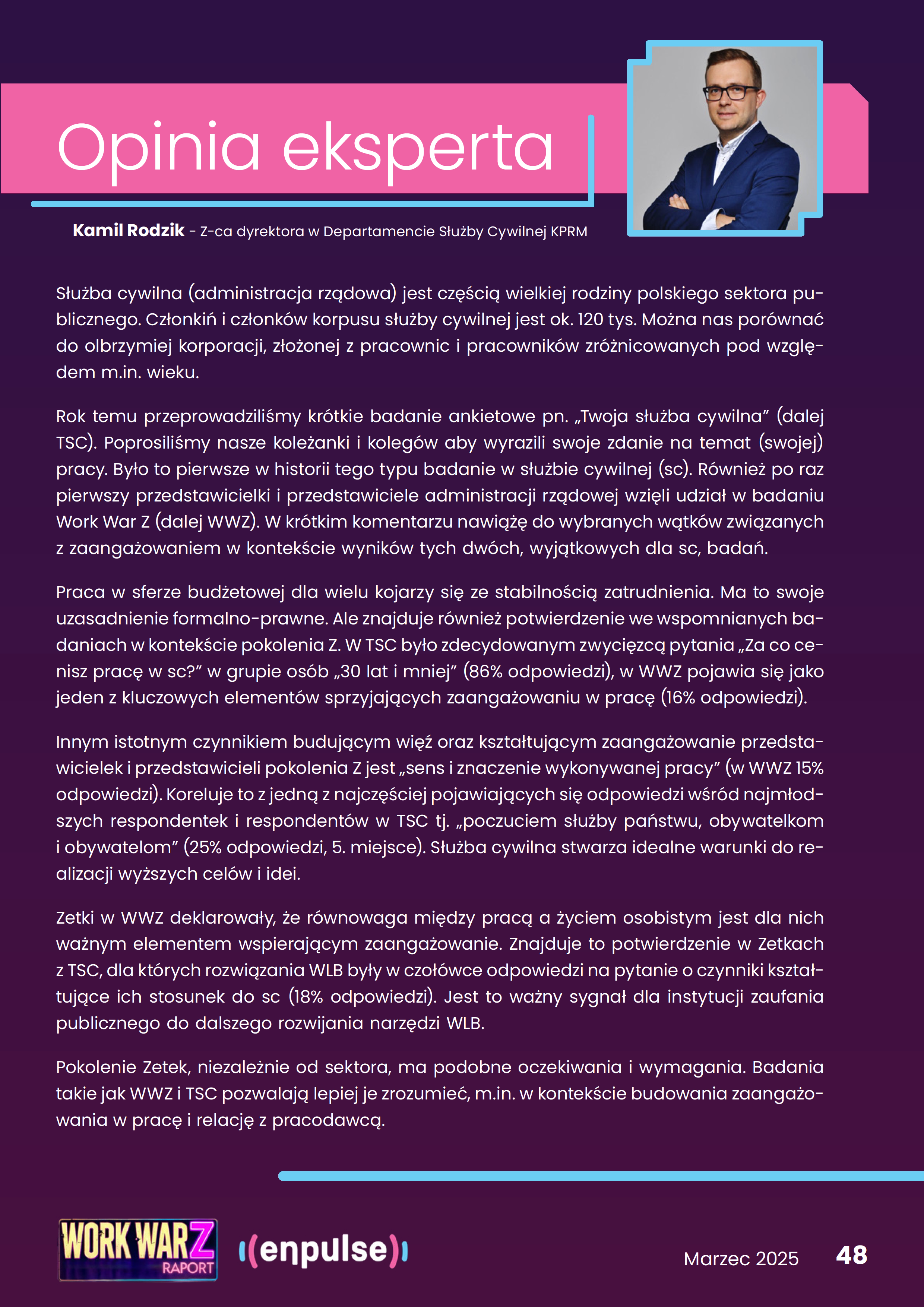 W badaniu Work War Z równowaga między pracą a życiem osobistym jest dla Zetek ważnym elementem, który wspiera zaangażowanie. Ten wniosek znajduje potwierdzenie w badaniu „Twoja Służba Cywilna”, które przeprowadziliśmy w minionym roku. Dla naszych Zetek rozwiązania work-life balance były w czołówce odpowiedzi na pytanie o czynniki kształtujące ich stosunek do służby cywilnej (18 proc. odpowiedzi). Jest to ważny sygnał dla instytucji zaufania publicznego, że dalsze rozwijanie narzędzi WLB jest właściwą i niezbędną strategią w zarządzaniu zasobami ludzkimi – stwierdził Kamil Rodzik, zastępca dyrektora Departamentu Służby Cywilnej.