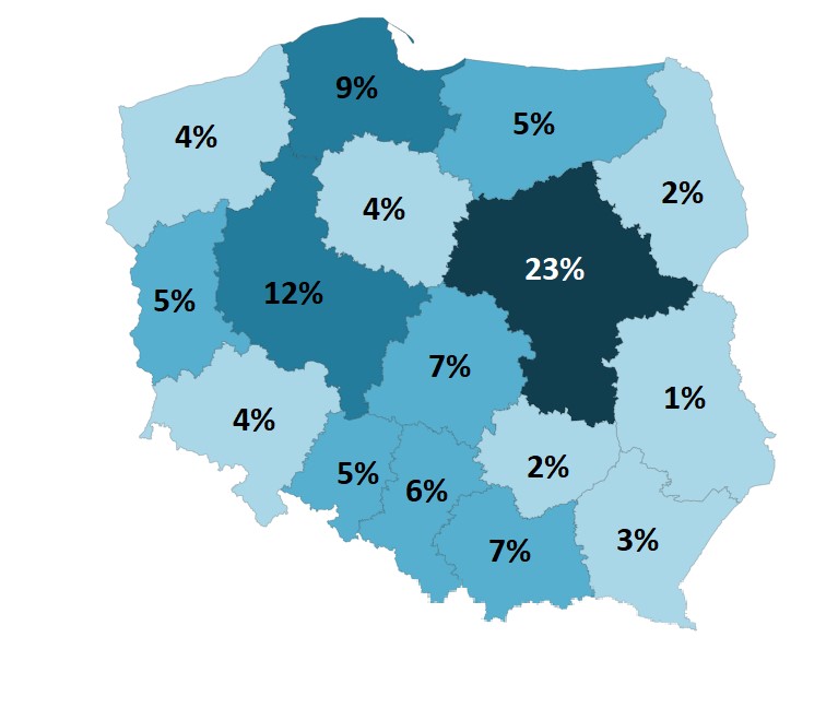 - najwyższy udział pracujących zdalnie odnotowujemy w województwach: mazowieckim – 23% i wielkopolskim – 12%, najniższy zaś w województwie lubelskim – 1%.