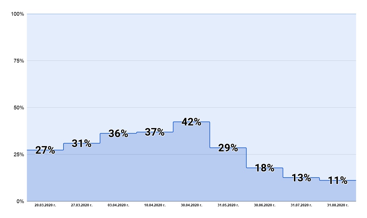 - w urzędach administracji terenowej (szczebla wojewódzkiego i powiatowego oraz administracji skarbowej), skala pracy w tym trybie zmalała do 2%,