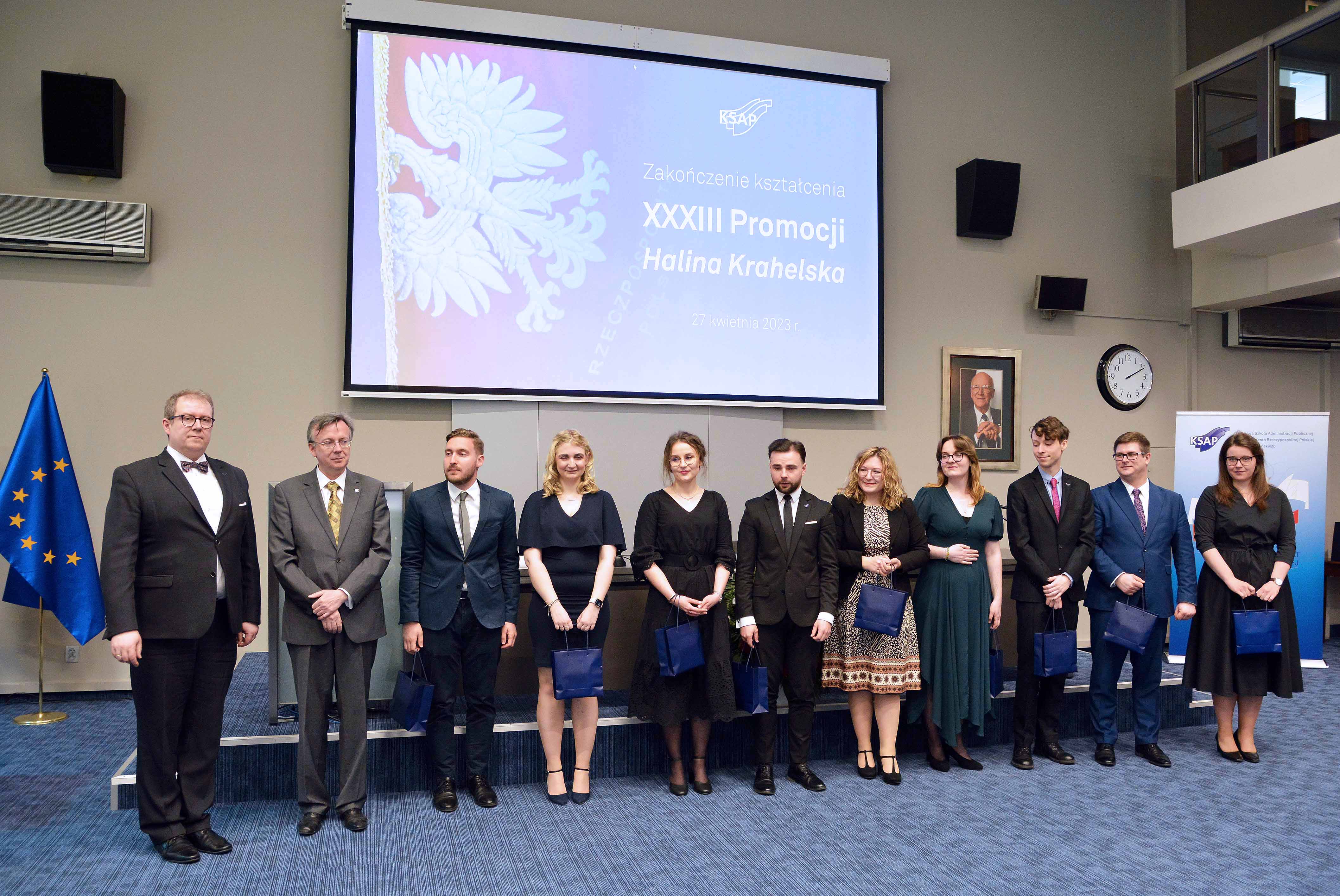 Wczoraj w Krajowej Szkole Administracji Publicznej im. Prezydenta Rzeczypospolitej Polskiej Lecha Kaczyńskiego odbyła się uroczystość zakończenia kształcenia słuchaczy XXXIII Promocji Halina Krahelska. Prezes Rady Ministrów Mateusz Morawiecki skierował list gratulacyjny do nowych absolwentów Szkoły. W uroczystości wziął także udział szef służby cywilnej Dobrosław Dowiat-Urbański, szef służby zagranicznej Arkady Rzegocki oraz podsekretarz stanu w Ministerstwie Zdrowia Marcin Martyniak. Po wydarzeniu odbyła się premiera książki prof. Marii Gintowt-Jankowicz „Apolityczność stosowana. Moje lata ze służbą cywilną” oraz 30. rocznica zakończenia kształcenia Pierwszej Promocji KSAP.